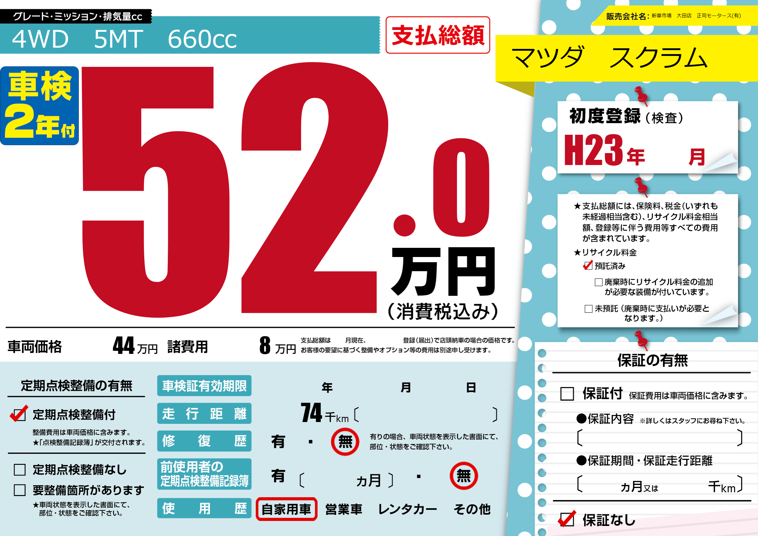 | 車名 | マツダ スクラム | グレード ミッション 排気量 |