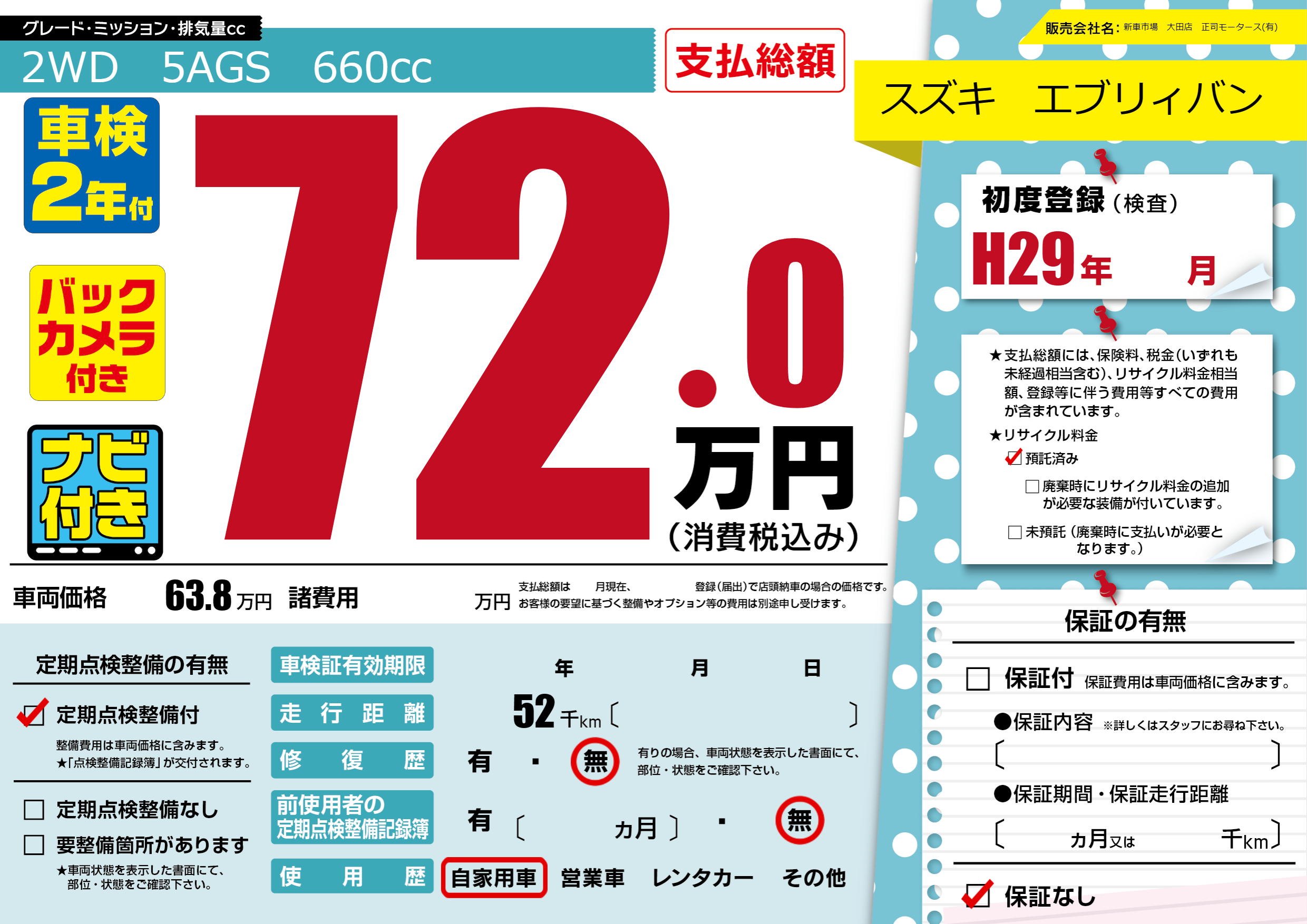 | 車名 | スズキ エブリィバン | グレード ミッション 排気量 |
