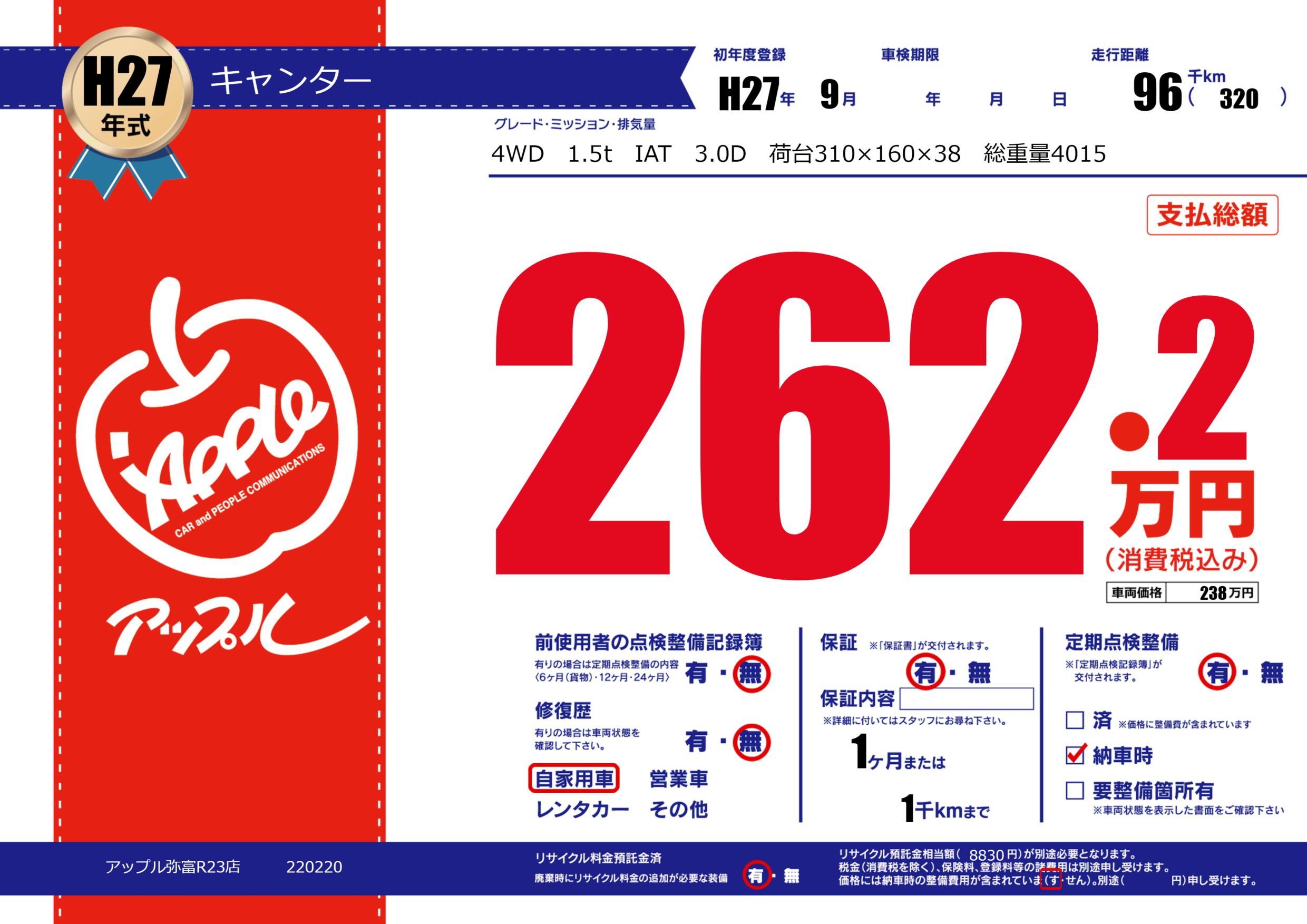 | 車名 | キャンター | グレード ミッション 排気量 |
