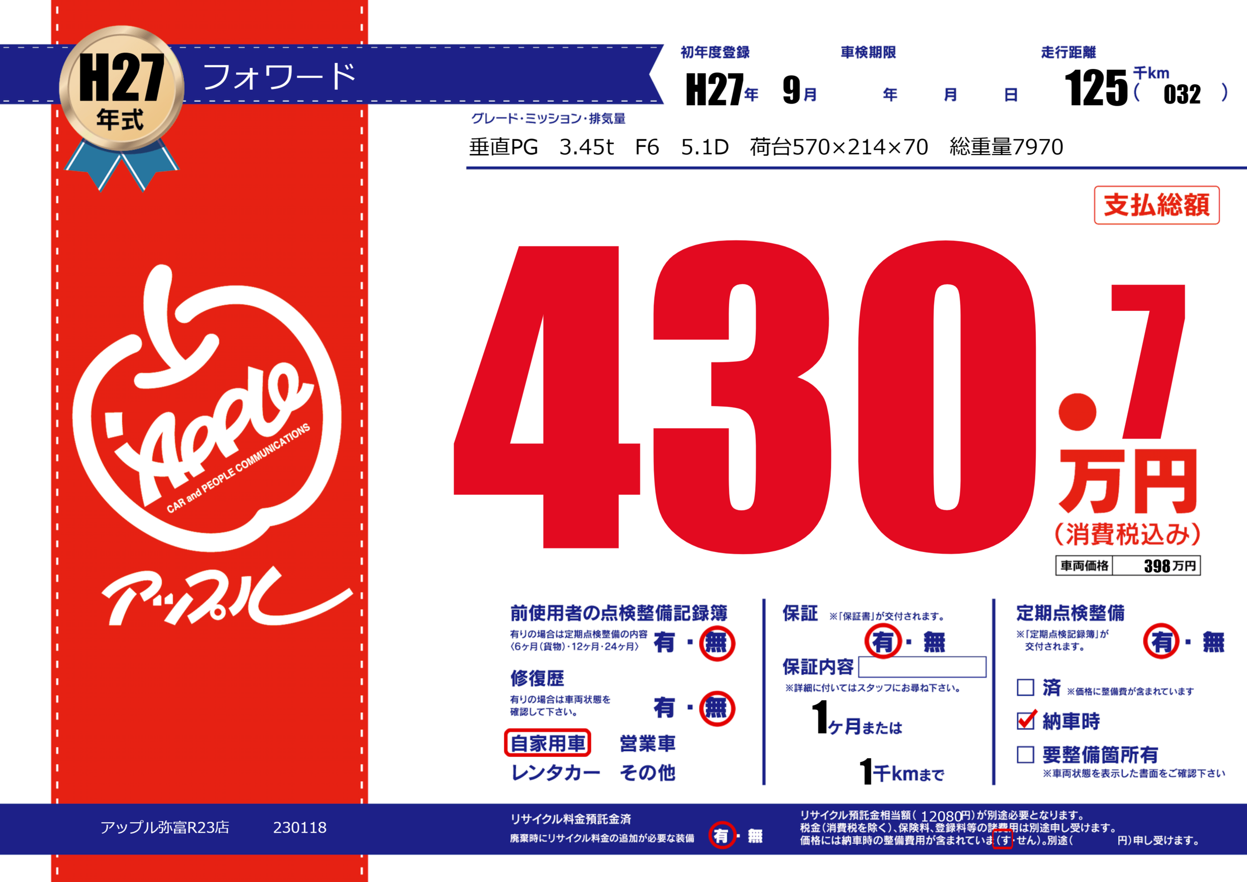 | 車名 | フォワード | グレード ミッション 排気量 |