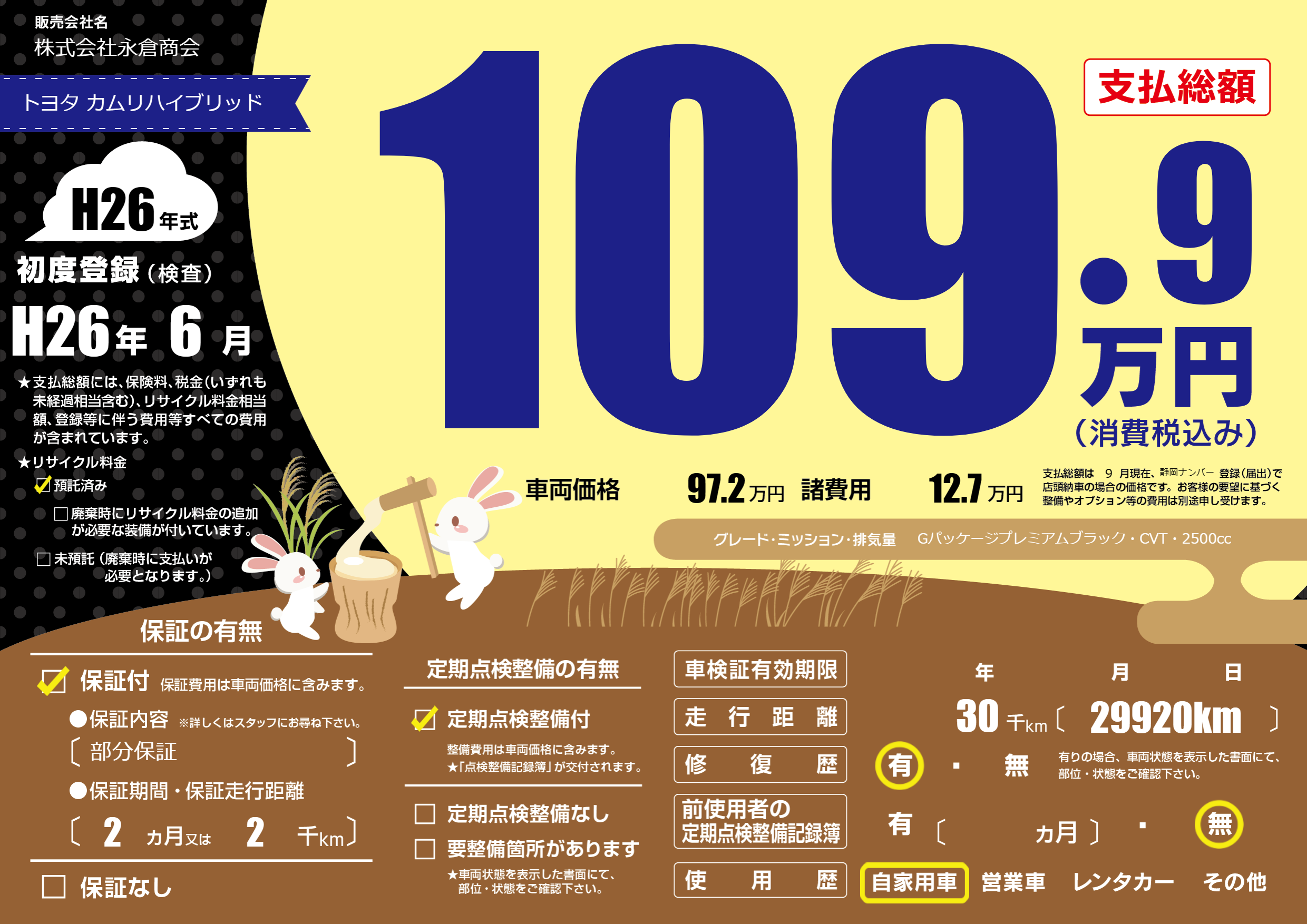 | 走行キロ | 3万km | 初年度登録 | H26年6月 |