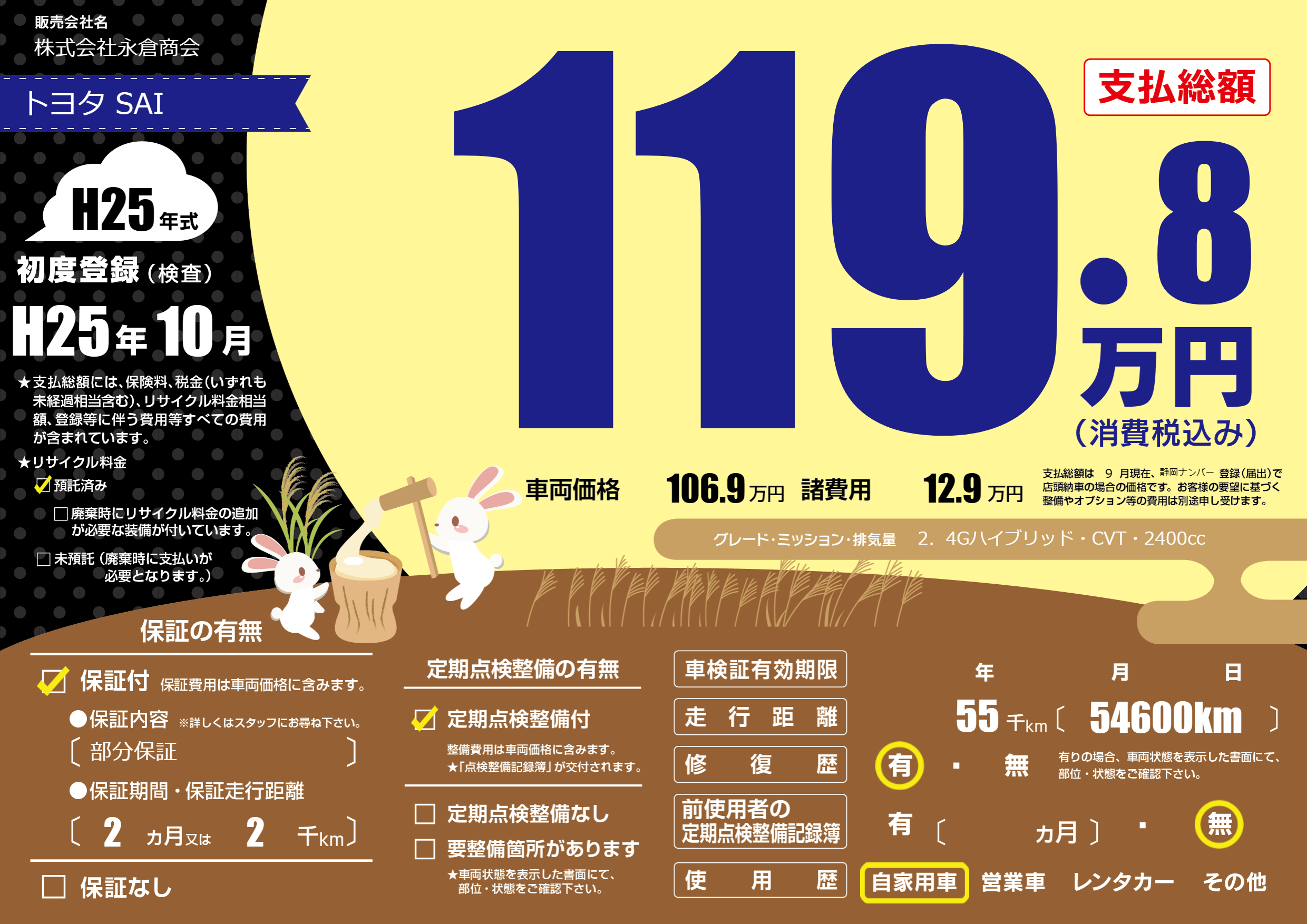 | 車名 | トヨタ SAI | グレード ミッション 排気量 |