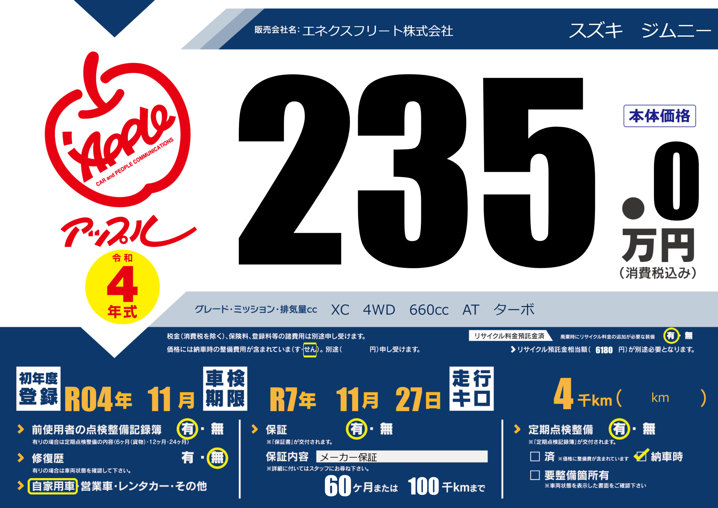 | 走行キロ | 0.4万km | 初年度登録 | R04年11月 |