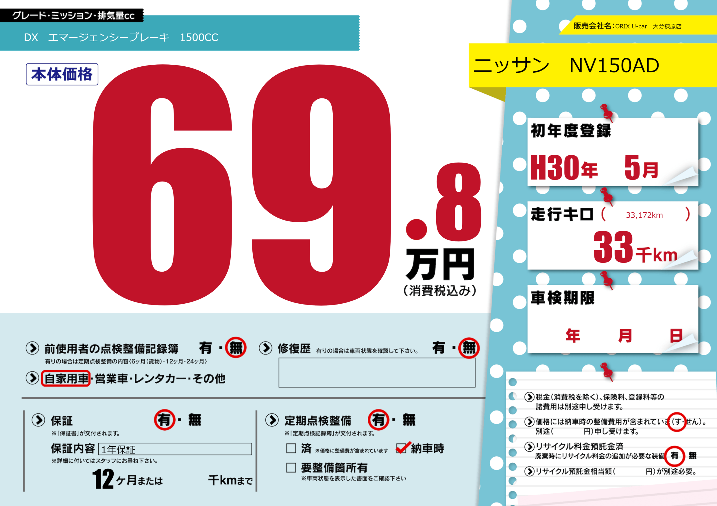 保証付き 保証内容(1年保証) 12ヶ月または()千kmまで |