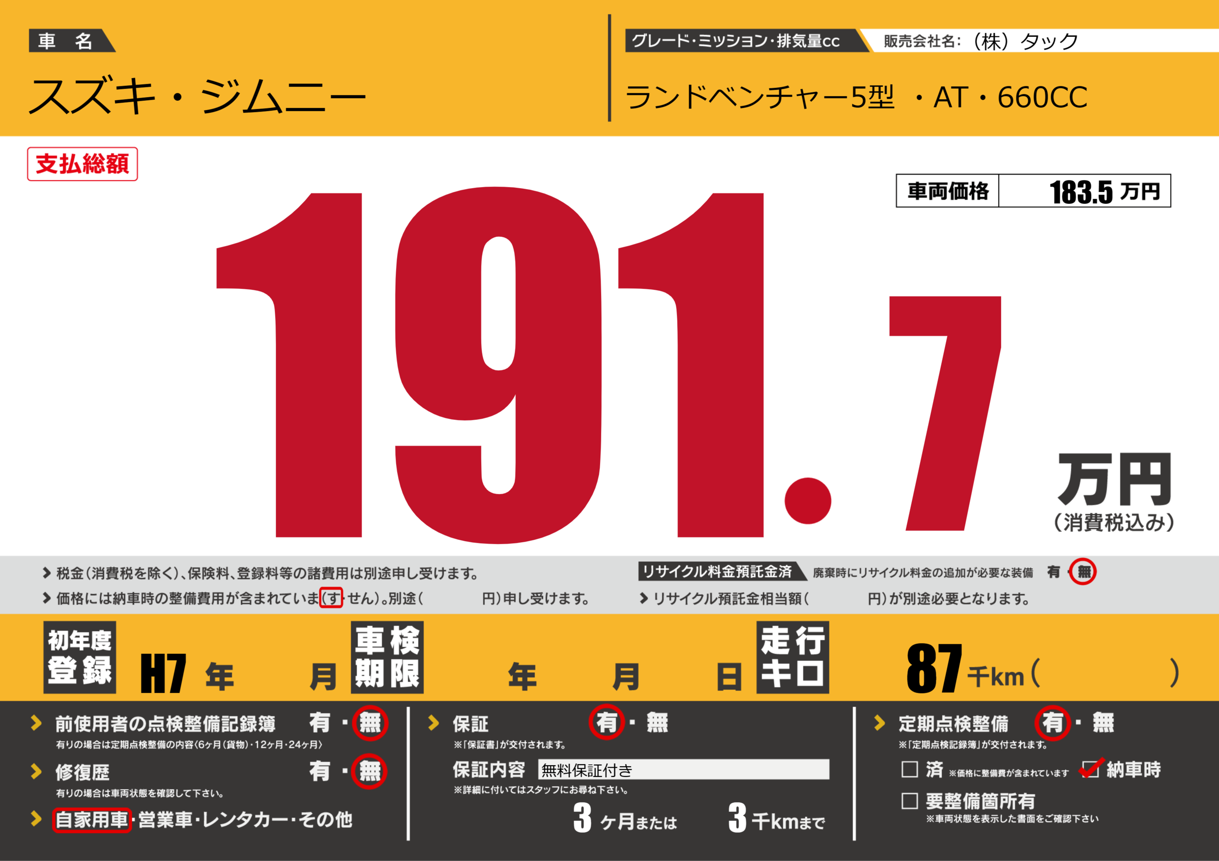 保証なし 保証内容(無料保証付き) 3ヶ月または(3)千kmまで |