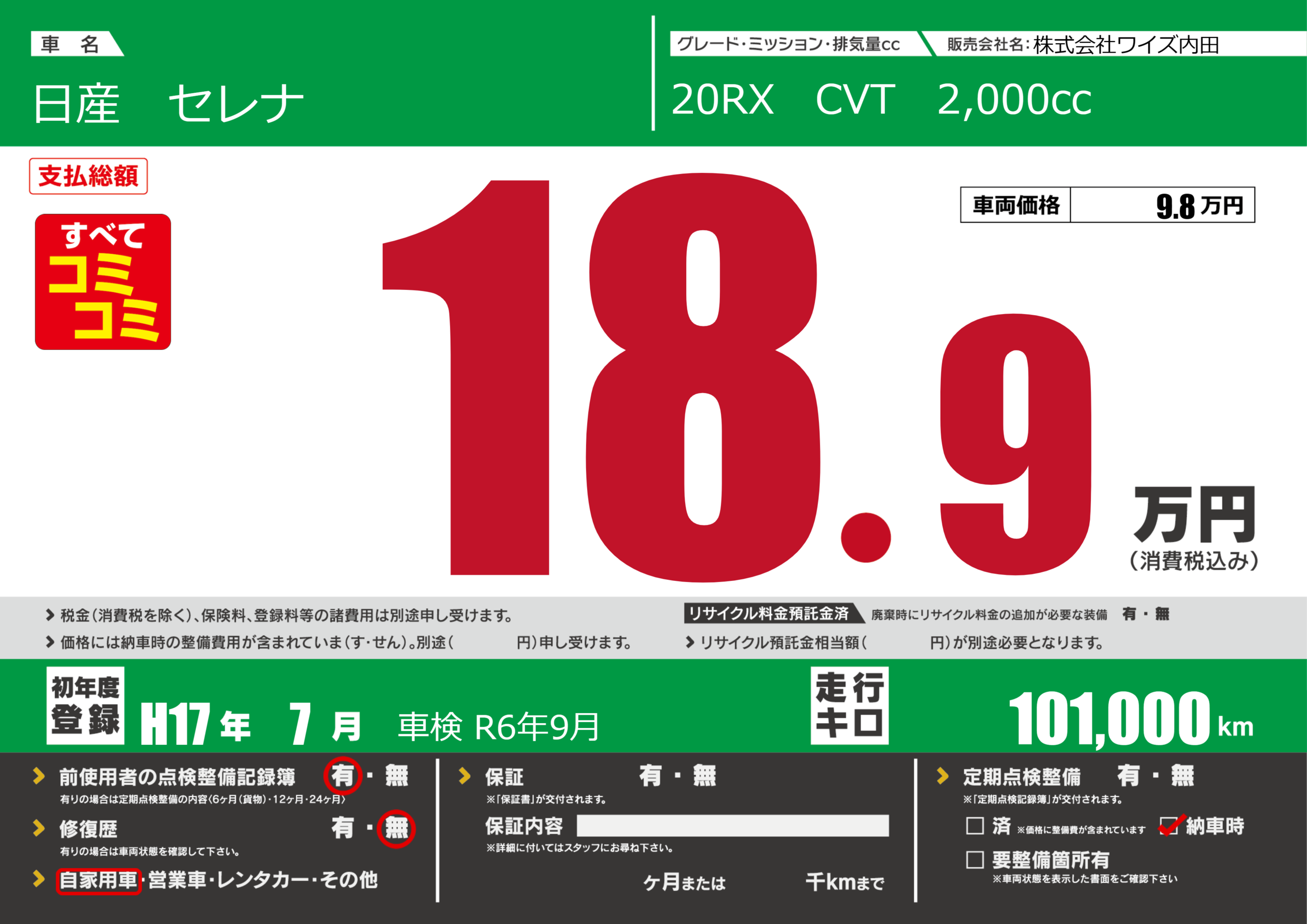 | 車名 | 日産 セレナ | グレード ミッション 排気量 |