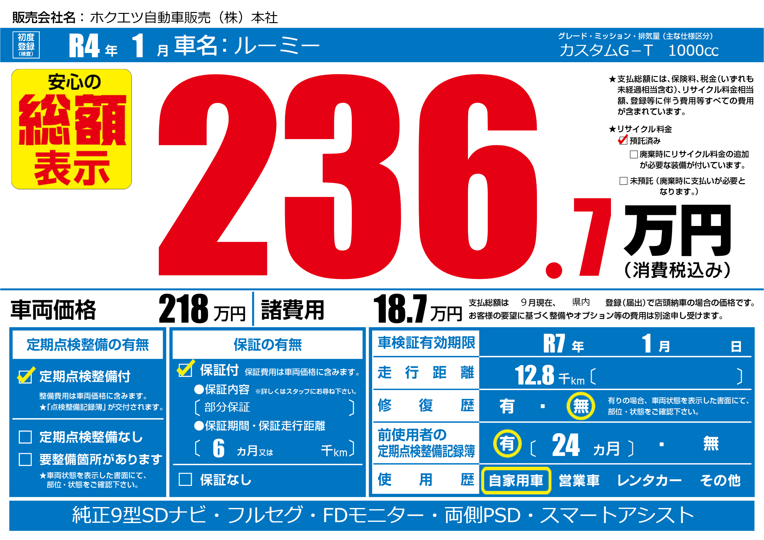 | 車名 | ルーミー | グレード ミッション 排気量 |