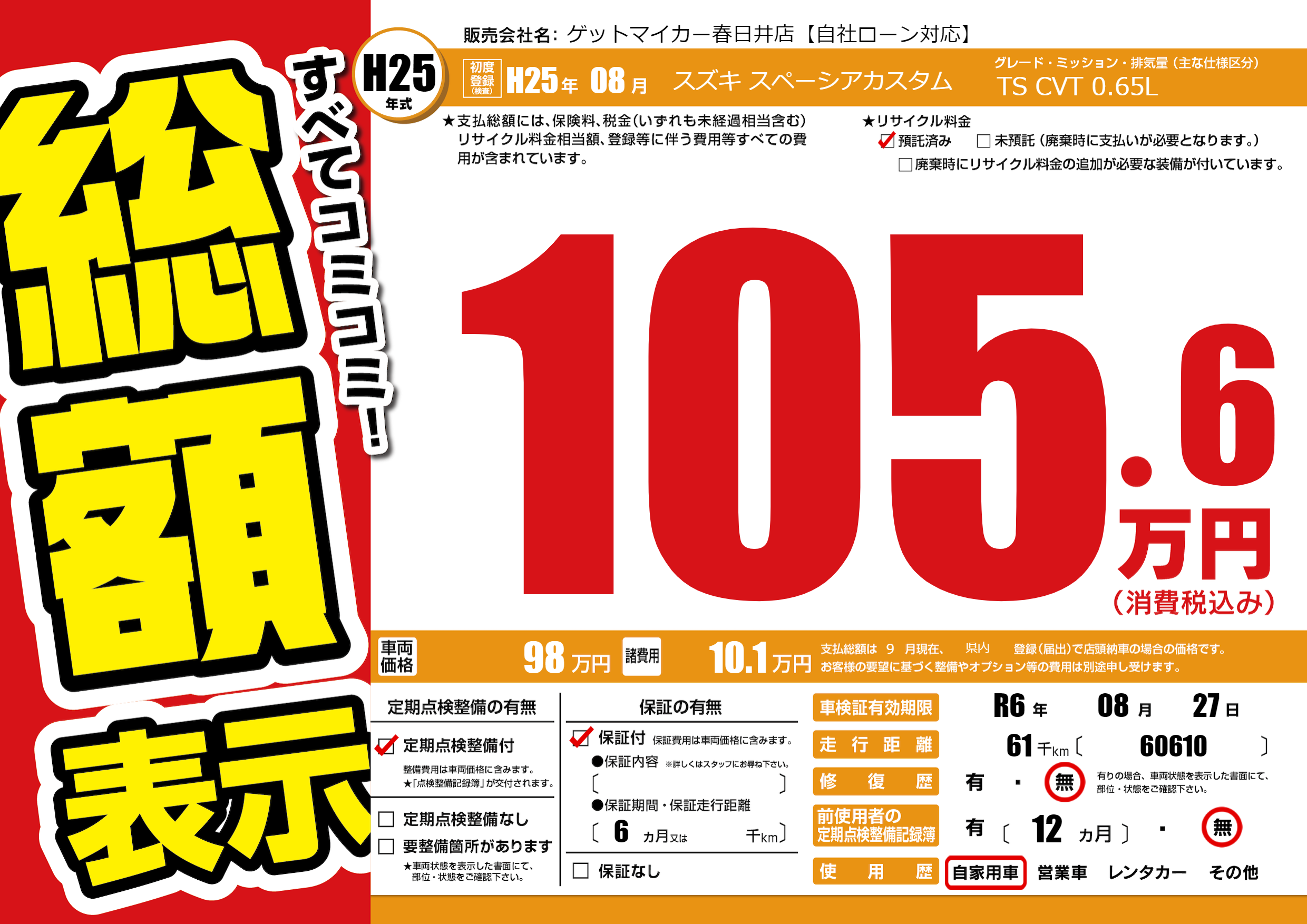 | 車名 | スズキ スペーシアカスタム | グレード ミッション 排気量 |