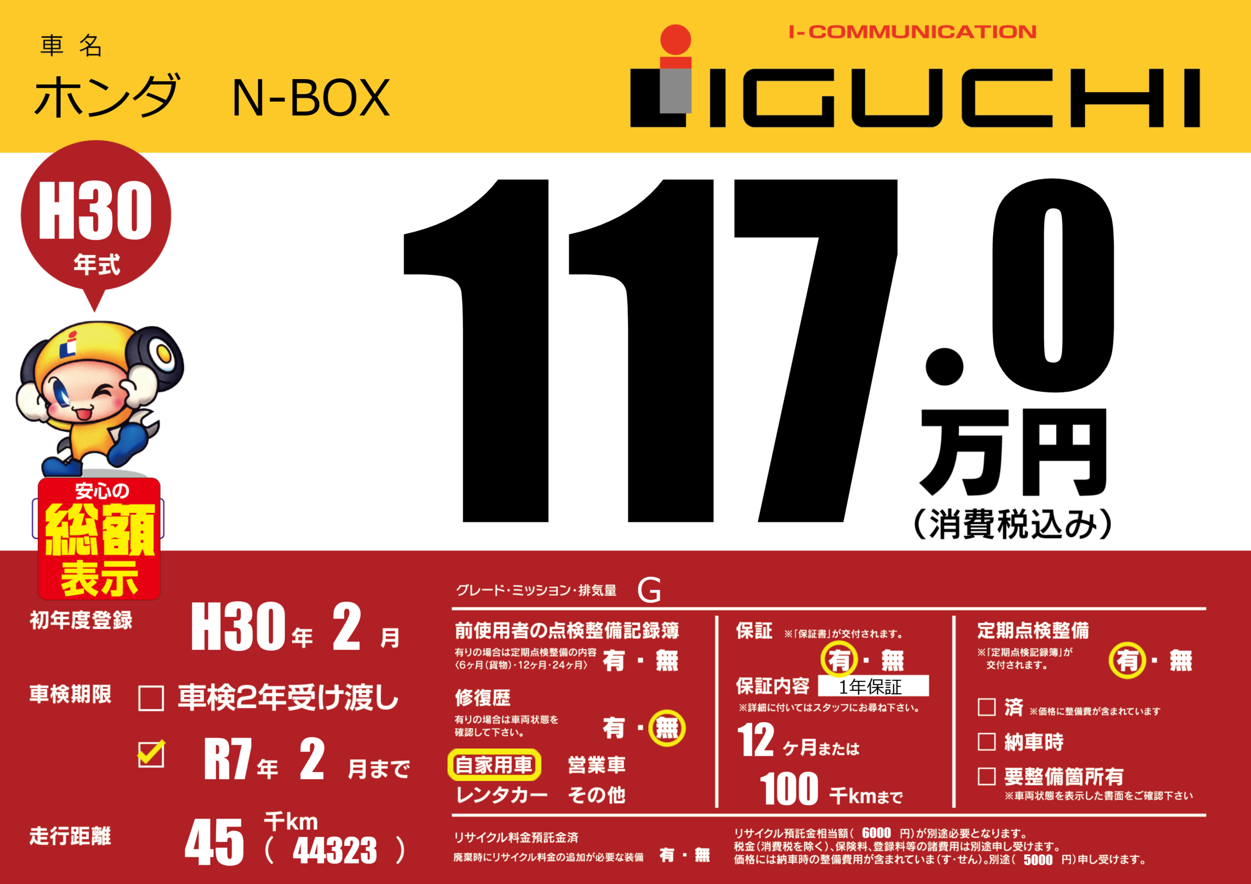 | 車名 | ホンダ N-BOX | グレード ミッション 排気量 |