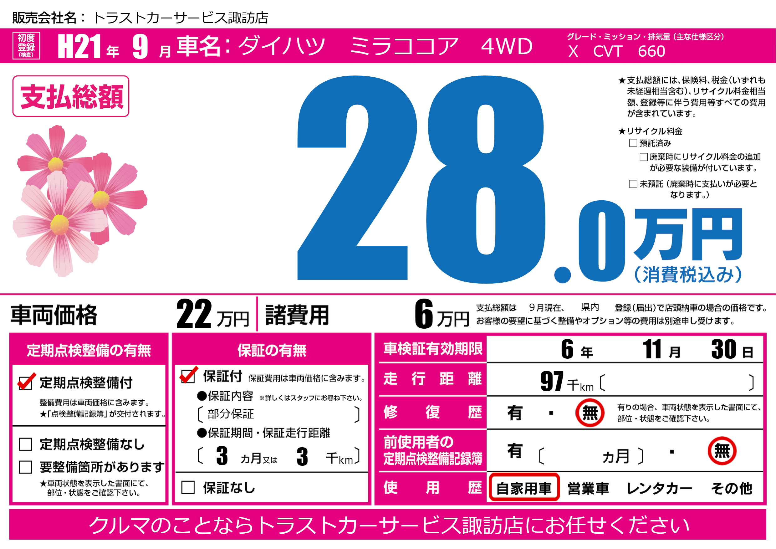 | 走行キロ | 9.7万km | 初年度登録 | H21年9月 |