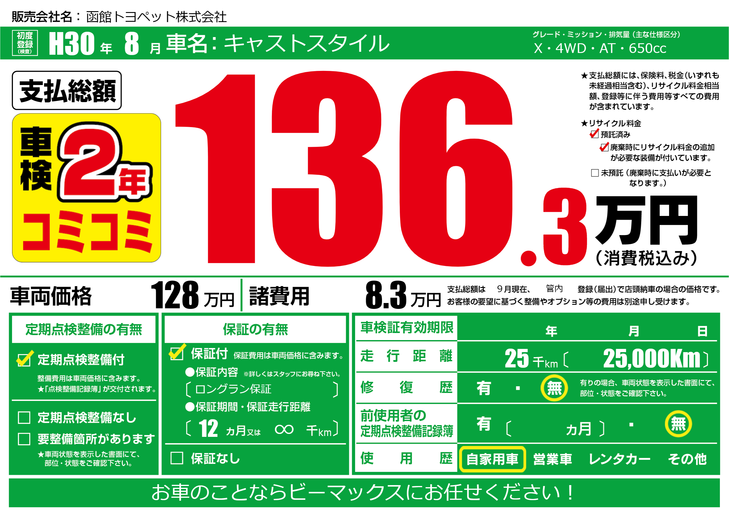 | 走行キロ | 2.5万km | 初年度登録 | H30年8月 |