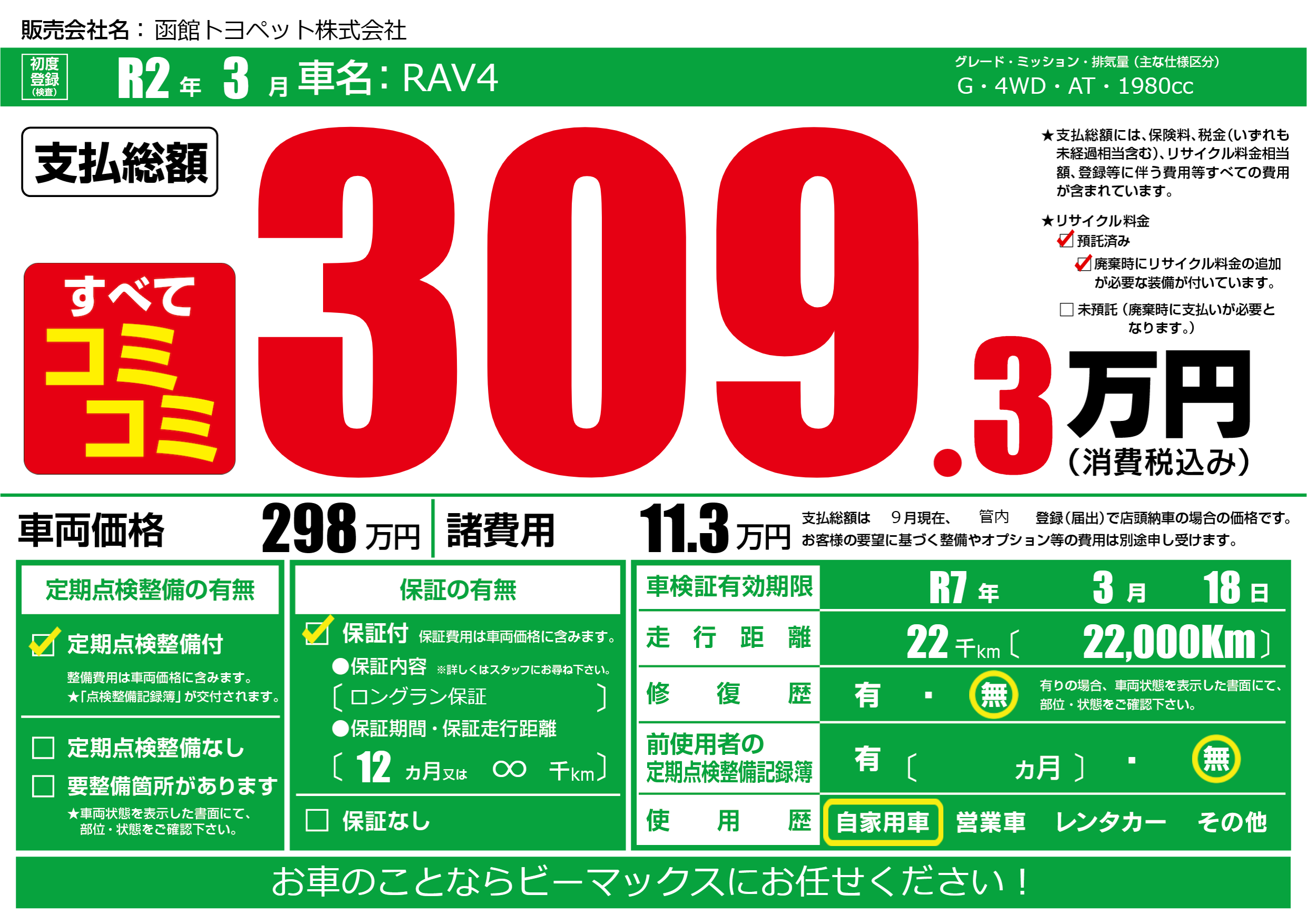 | 走行キロ | 2.2万km | 初年度登録 | R2年3月 |