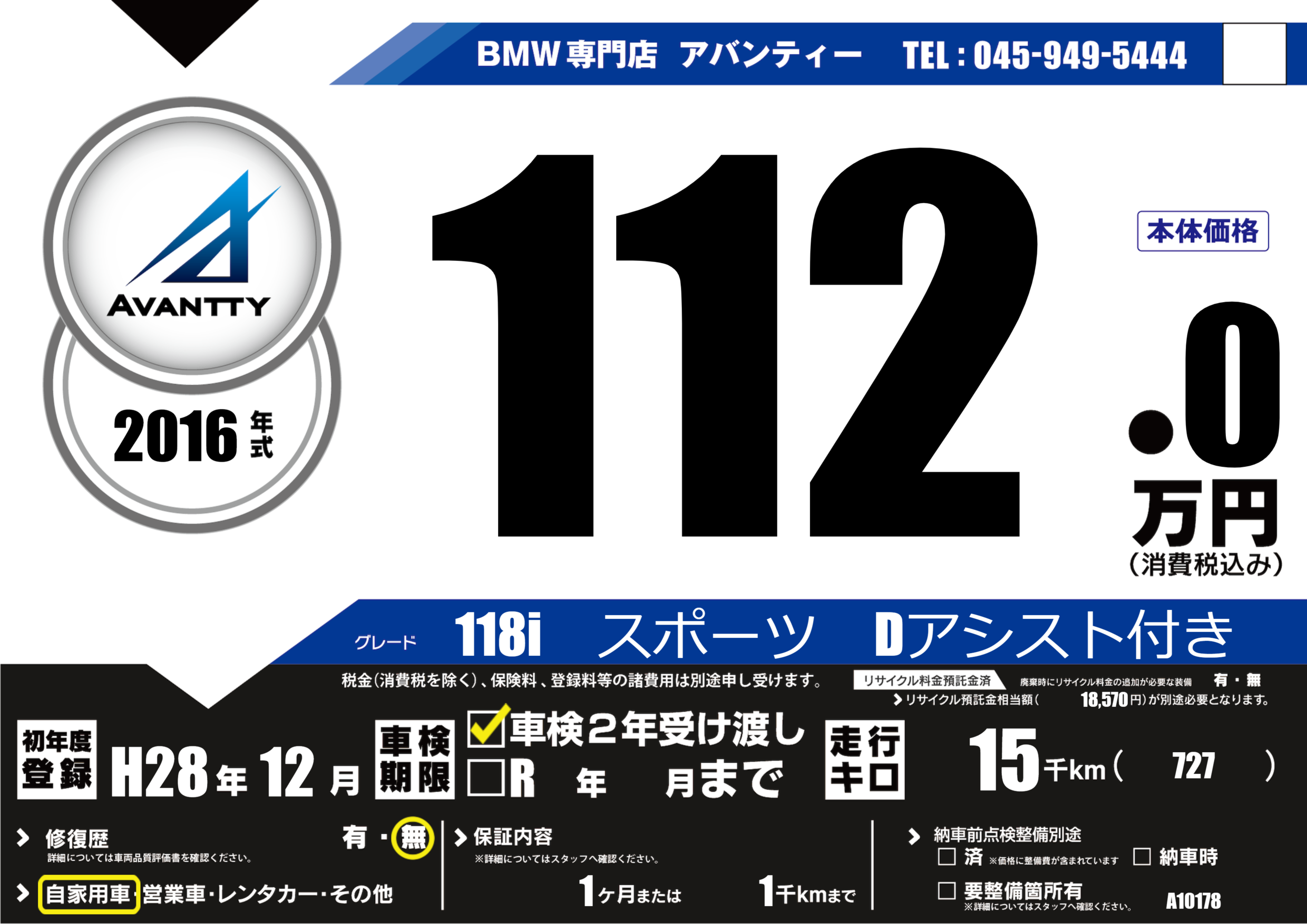 | 走行キロ | 1.5万km | 初年度登録 | H28年12月 |