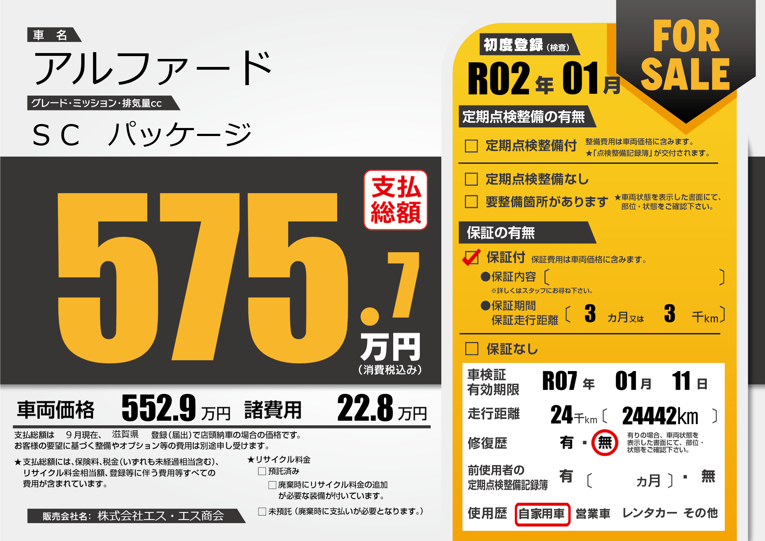 | 車名 | アルファード | グレード ミッション 排気量 |