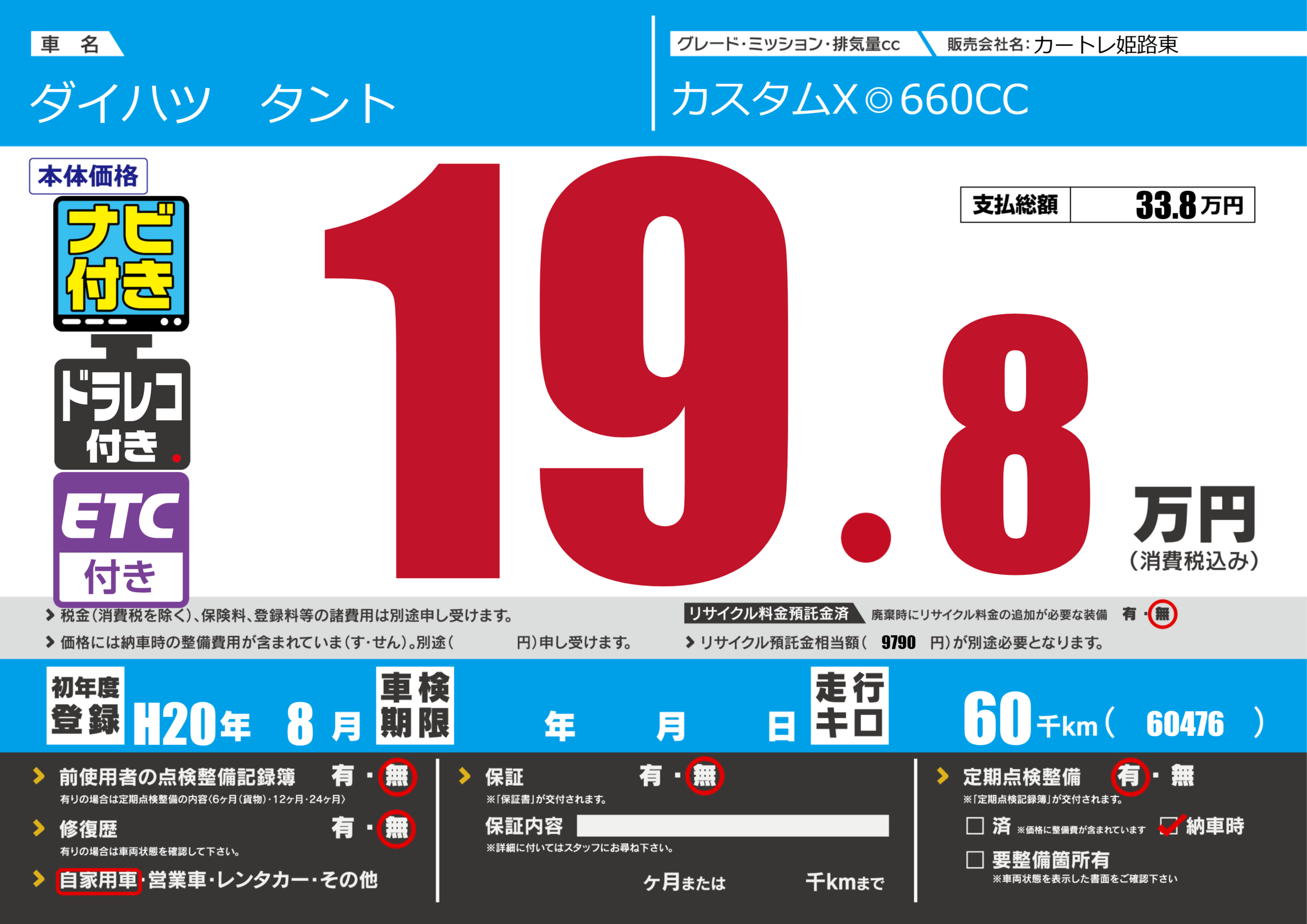 | 走行キロ | 6万km | 初年度登録 | H20年8月 |