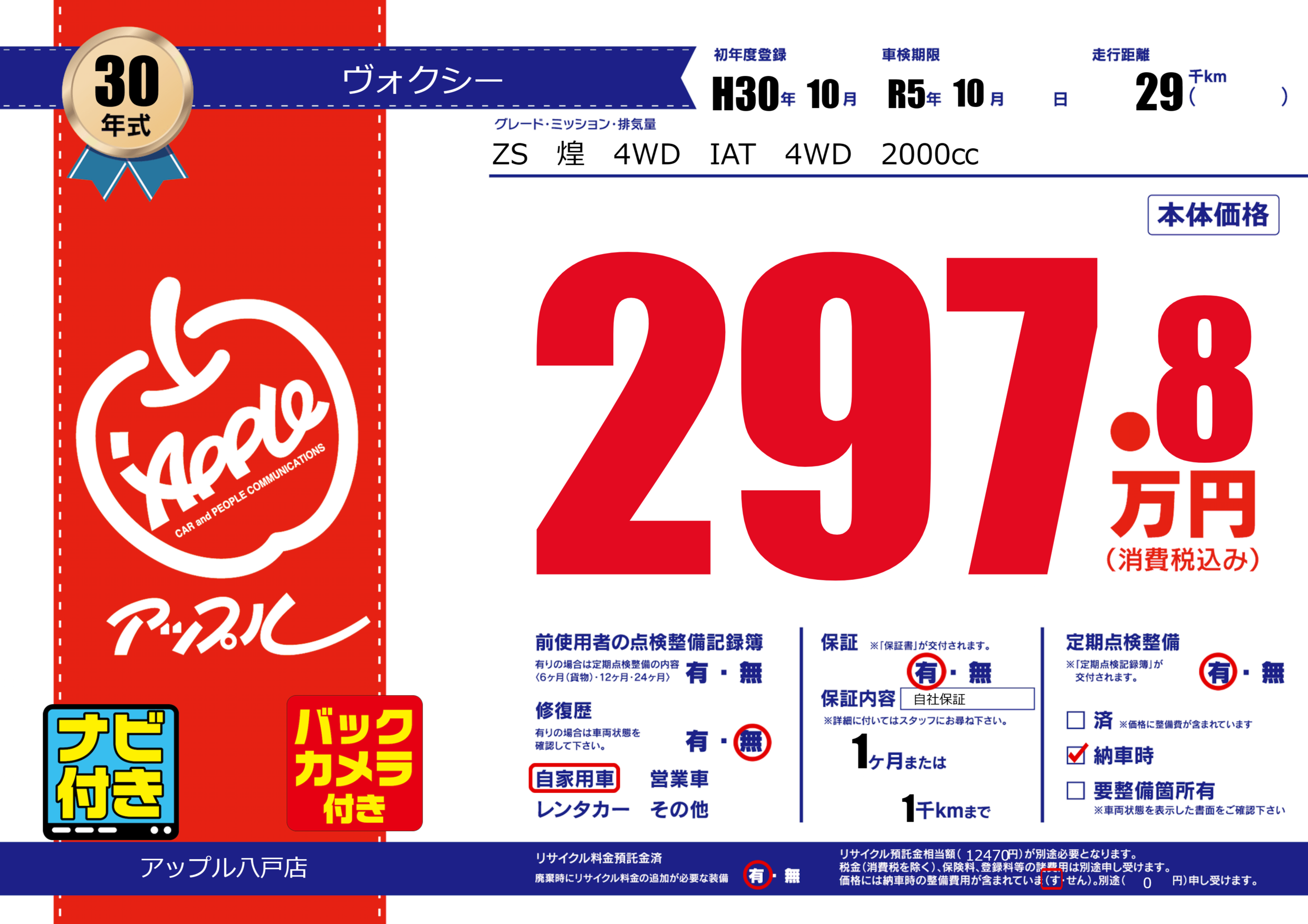 保証付き 保証内容( 自社保証) 1ヶ月または(1)千kmまで |
