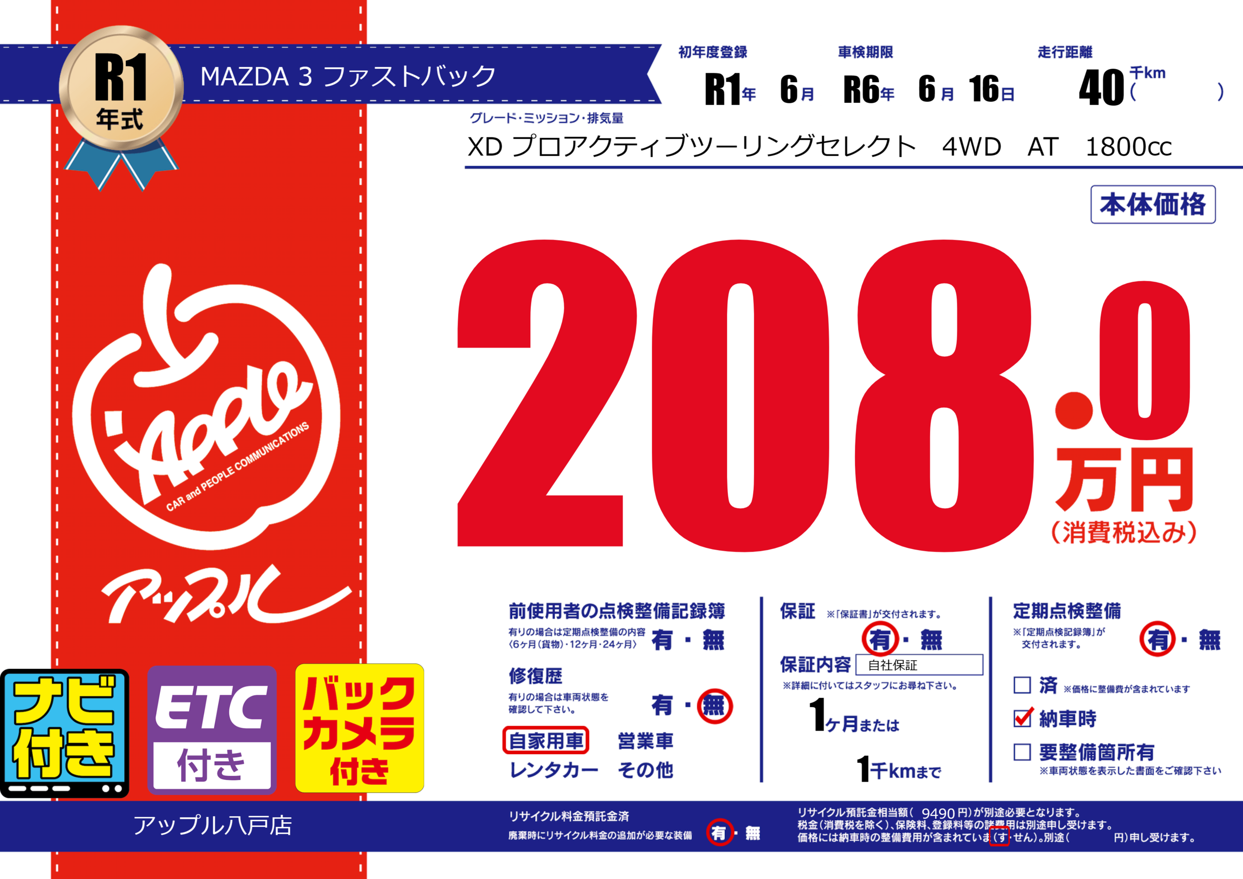 保証付き 保証内容( 自社保証) 1ヶ月または(1)千kmまで |