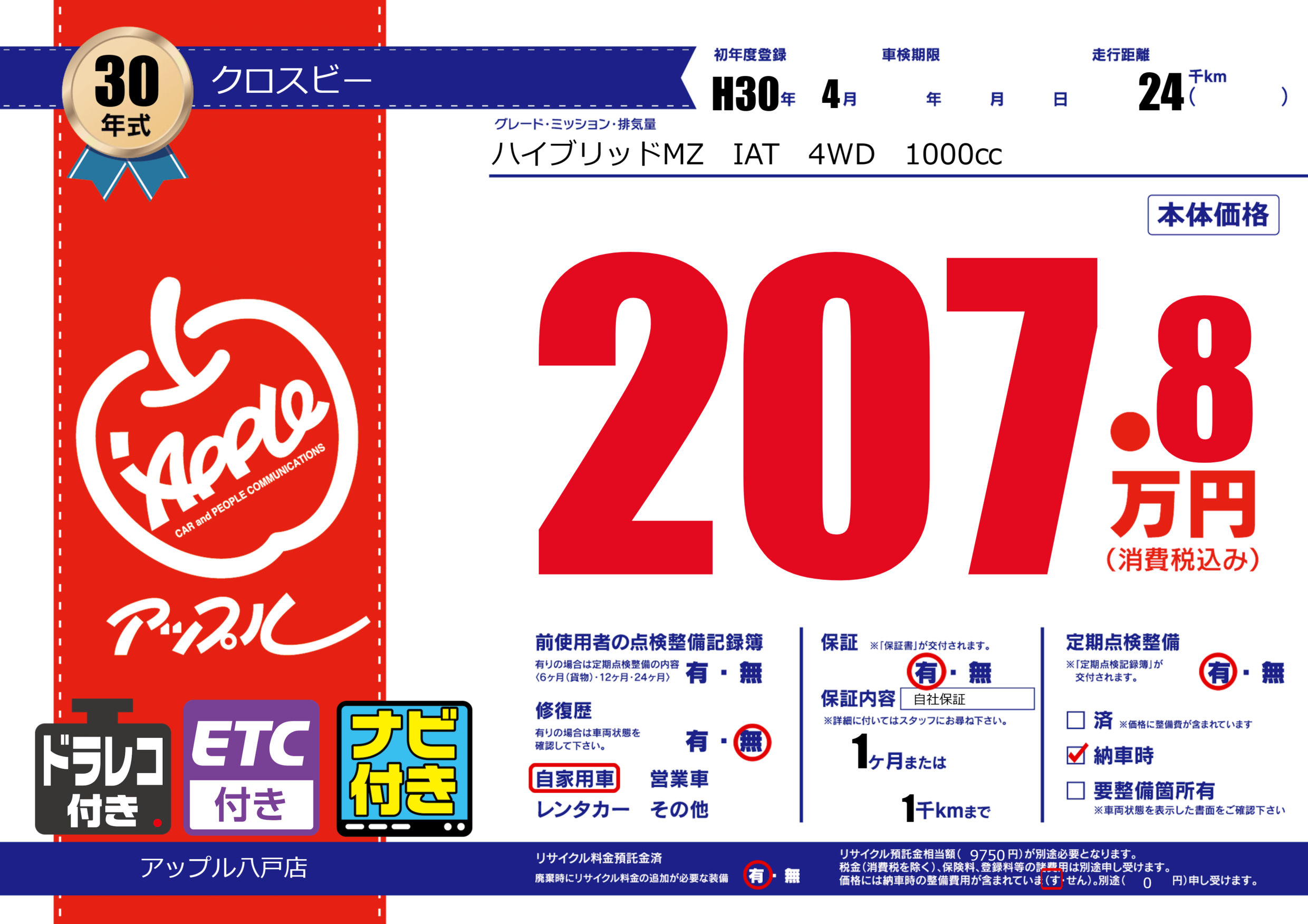 保証付き 保証内容( 自社保証) 1ヶ月または(1)千kmまで |