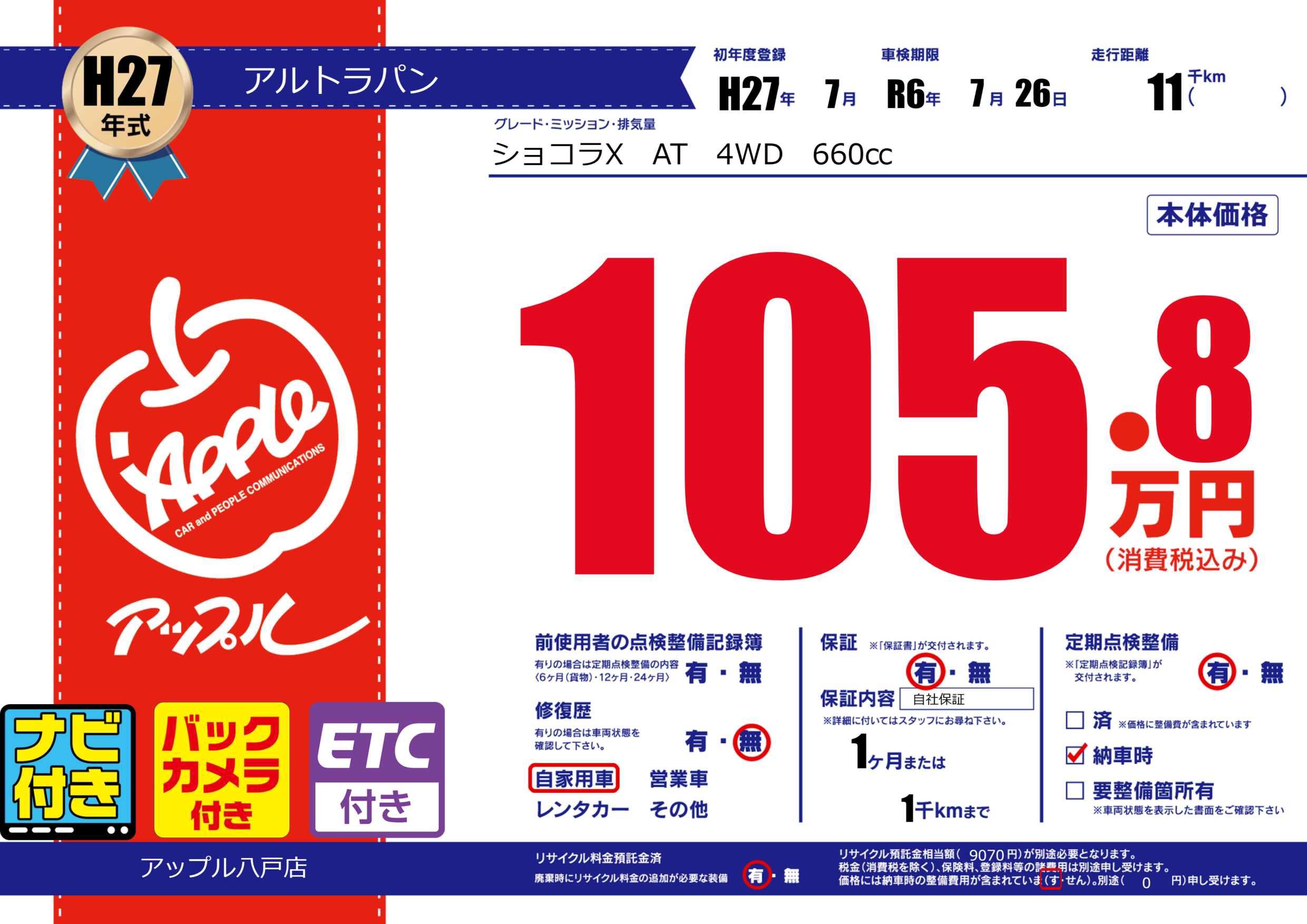 | 走行キロ | 1.1万km | 初年度登録 | H27年7月 |