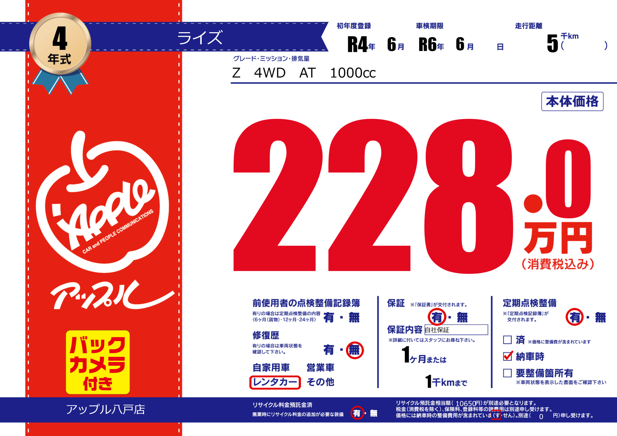 | 走行キロ | 0.5万km | 初年度登録 | R4年6月 |