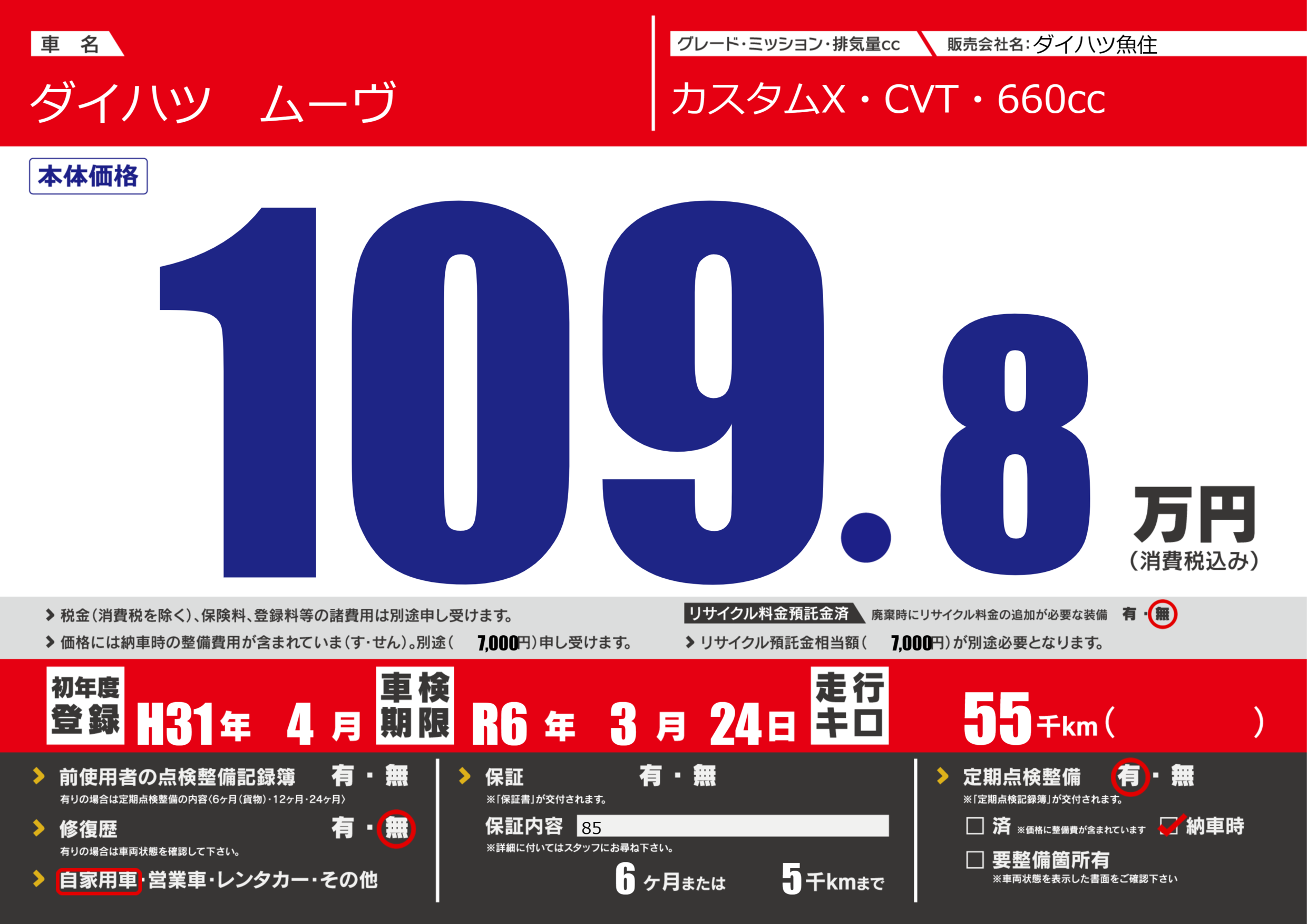 | 定期点検整備 | 定期点検整備あり 納車時あり | ||