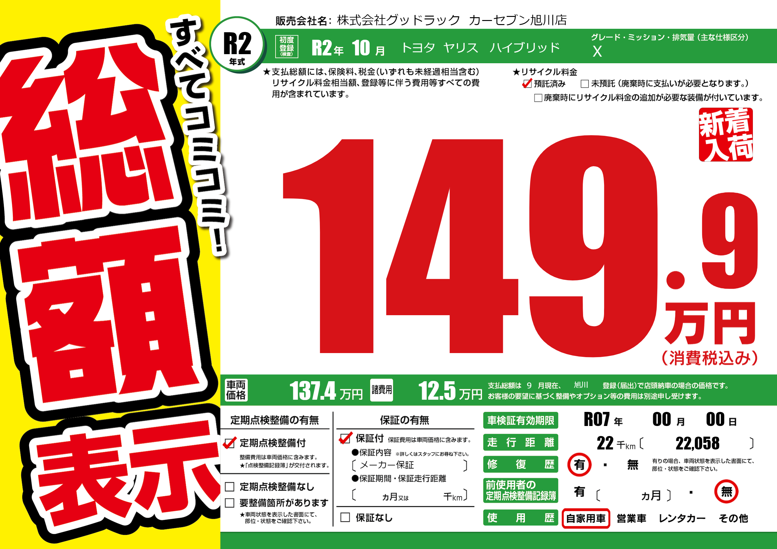 | 車名 | トヨタ ヤリス ハイブリッド | グレード ミッション 排気量 |