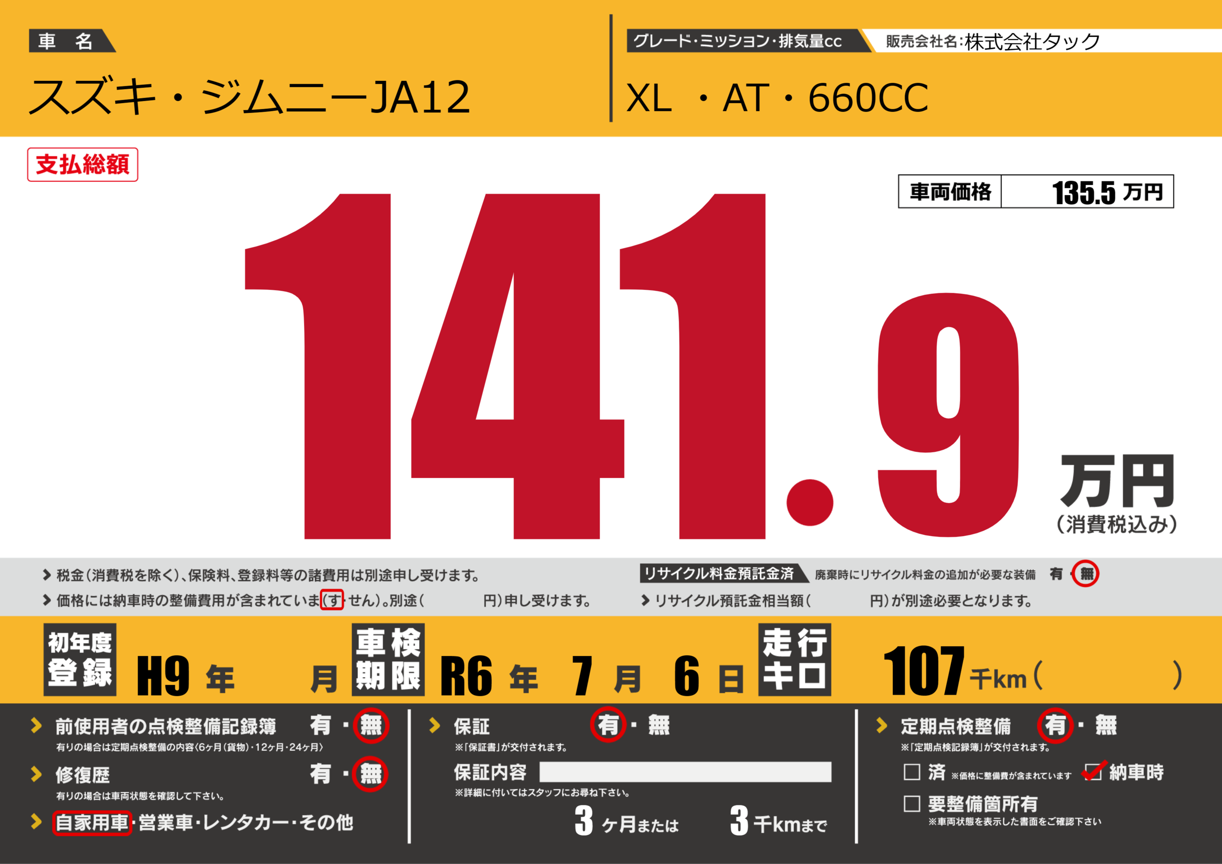 | 定期点検整備 | 定期点検整備あり 納車時あり | ||