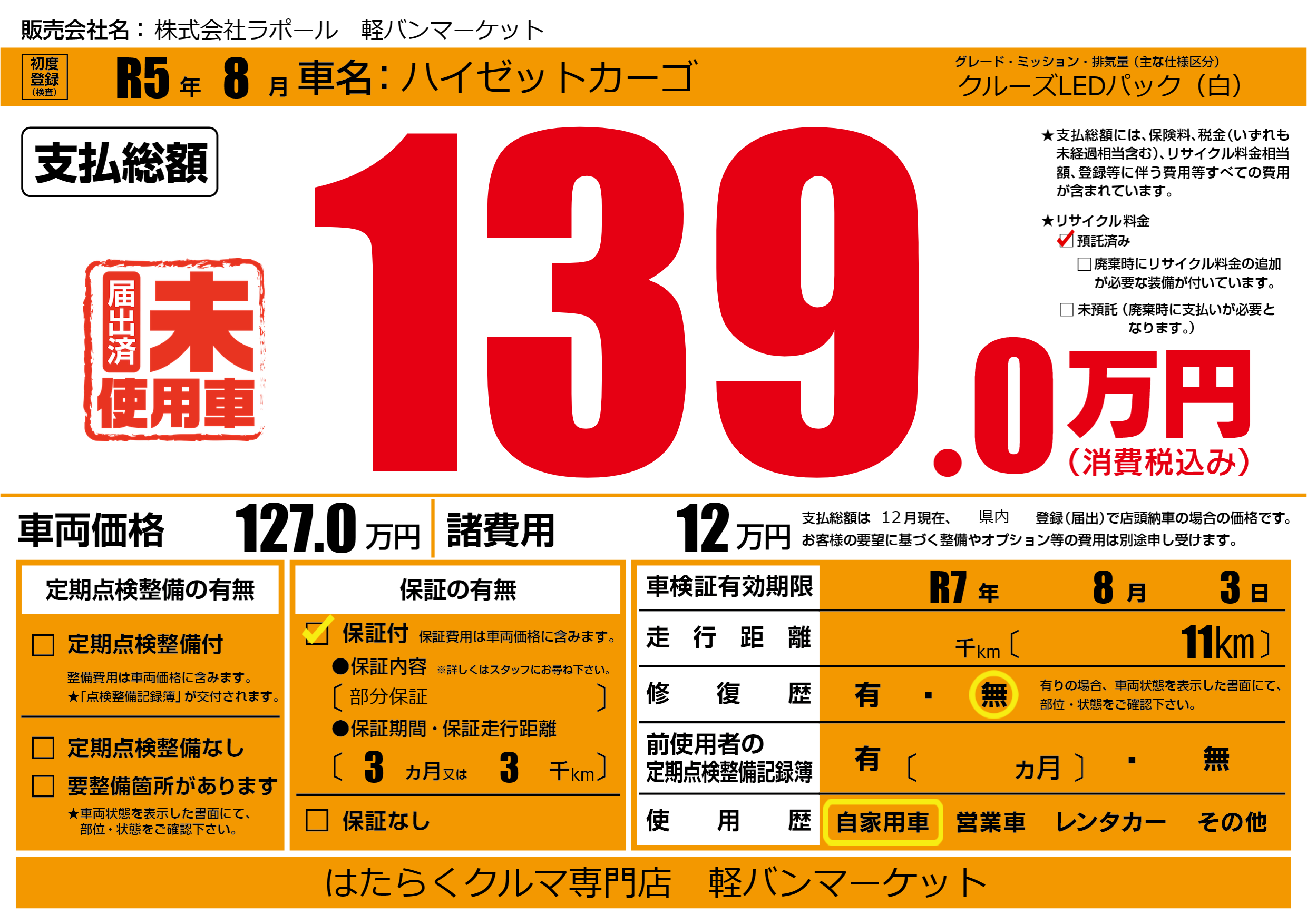 | 走行キロ | - | 初年度登録 | R5年8月 |