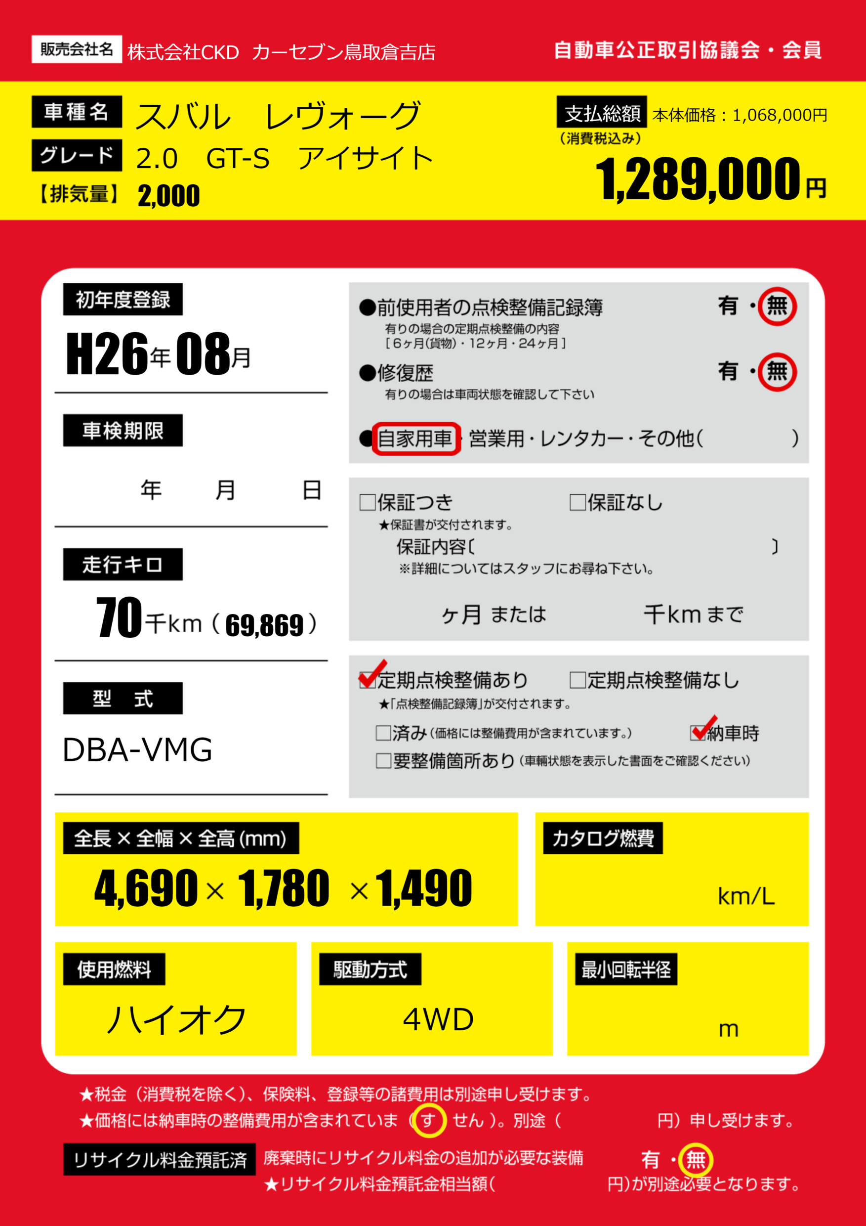 | 車名 | スバル レヴォーグ | グレード ミッション 排気量 |