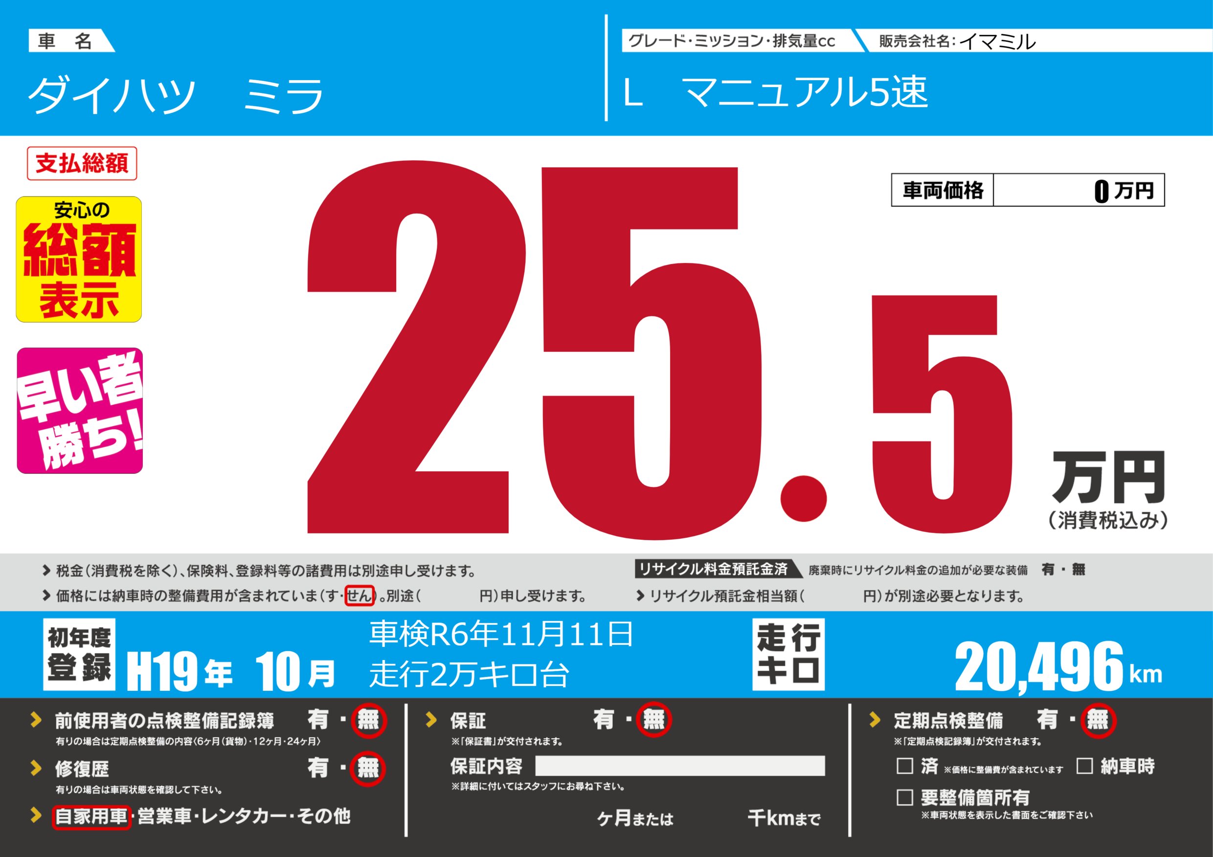 | 車名 | ダイハツ ミラ | グレード ミッション 排気量 |