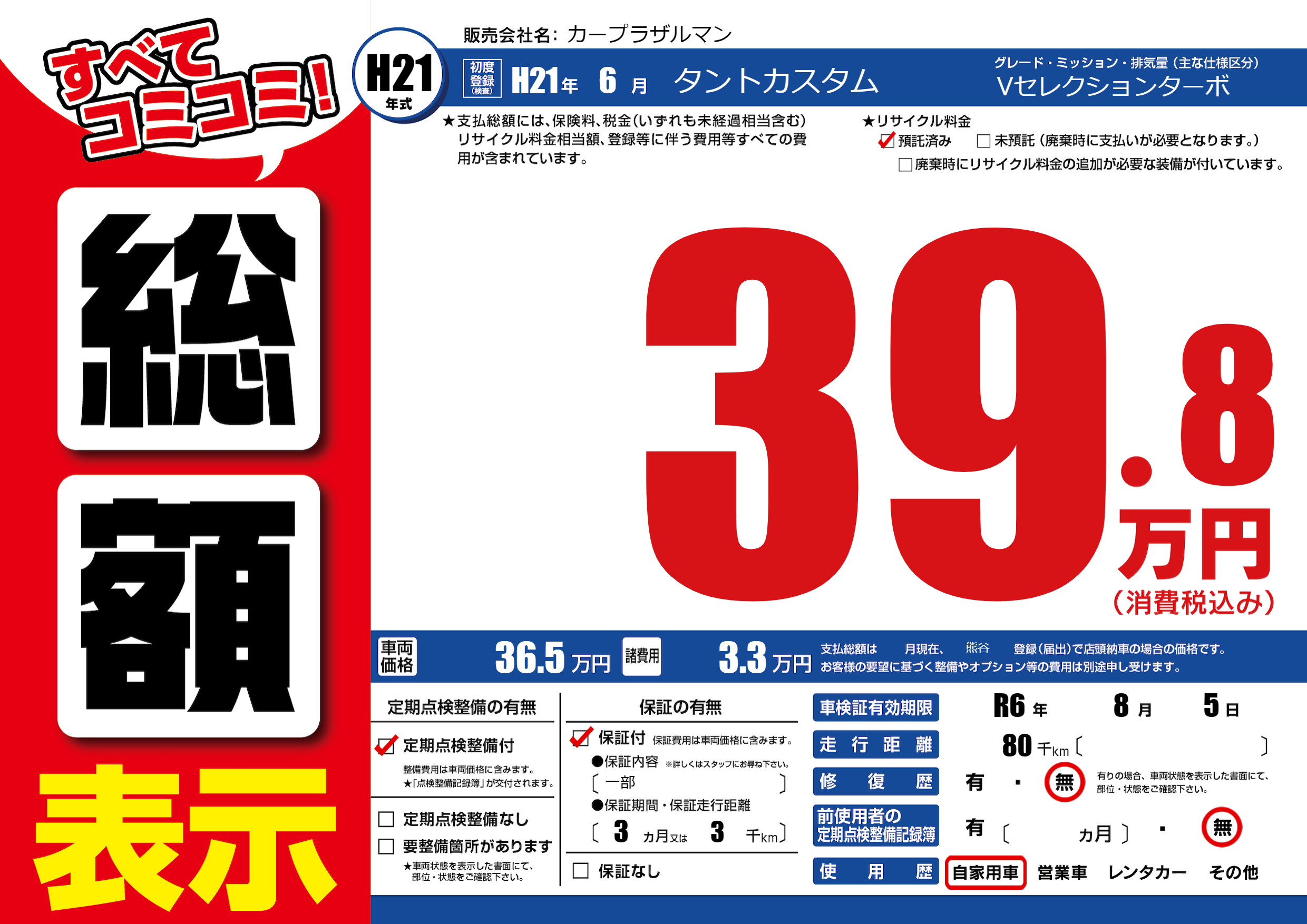 | 走行キロ | 8万km | 初年度登録 | H21年6月 |