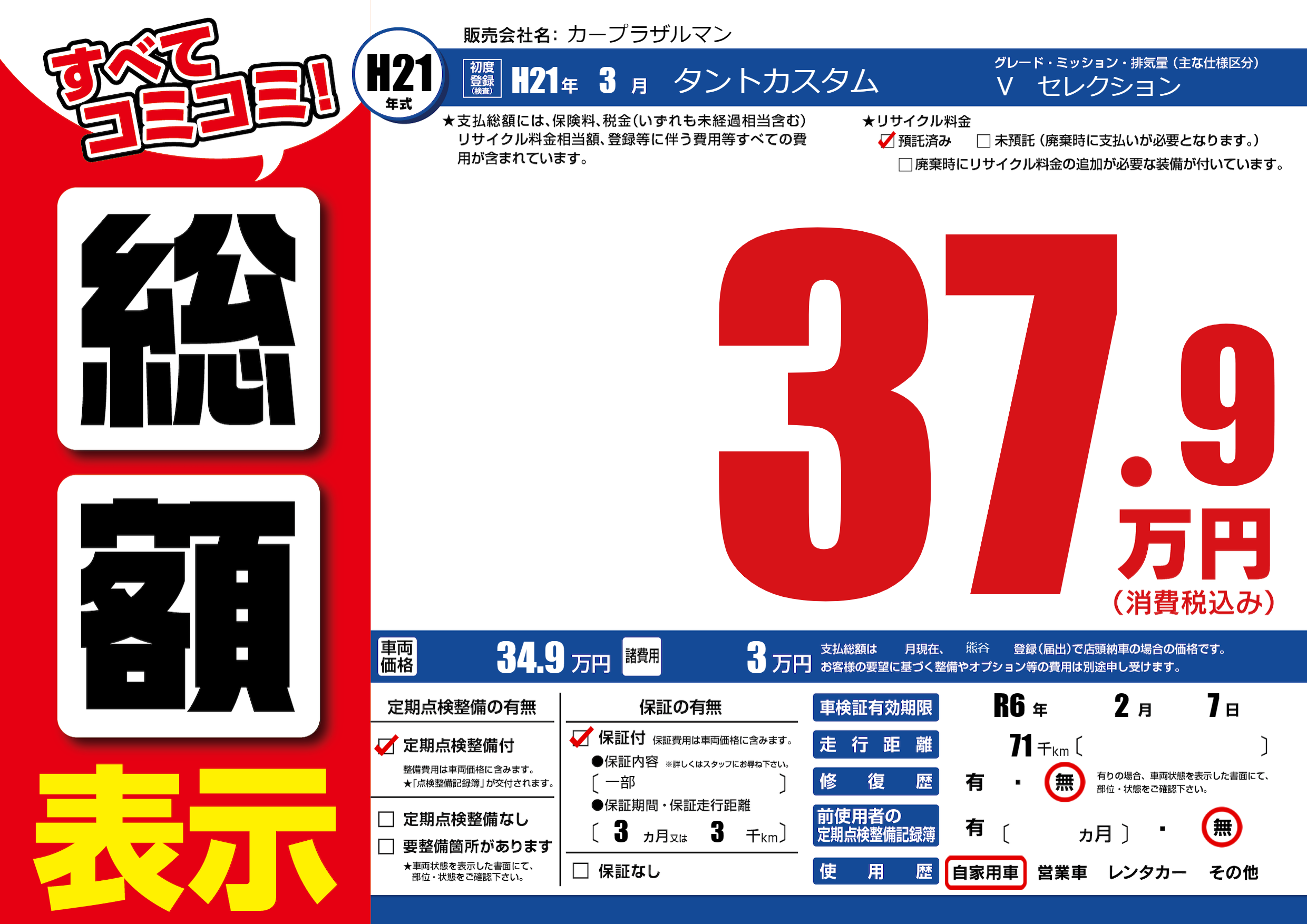 | 車名 | タントカスタム | グレード ミッション 排気量 |