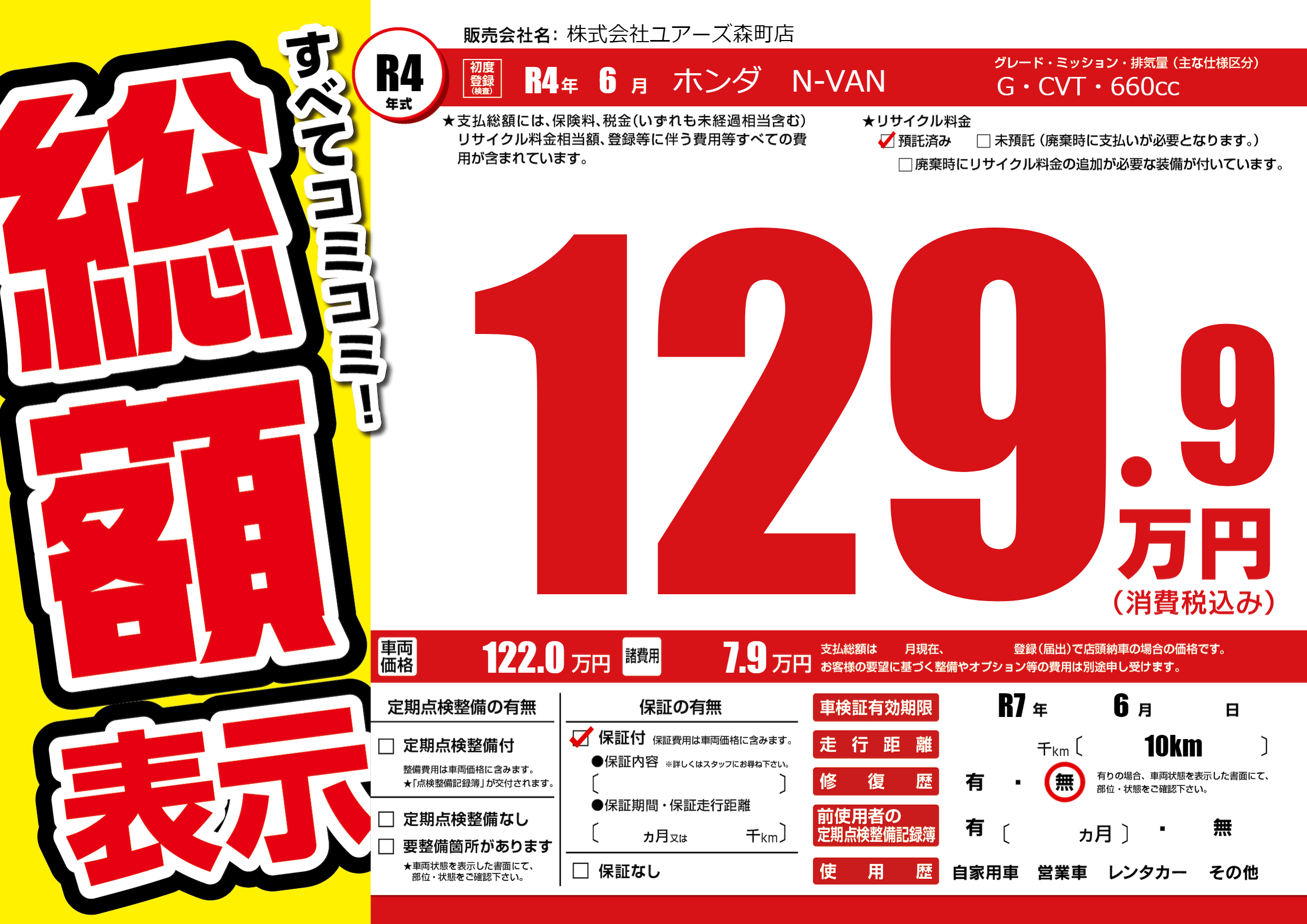 | 車名 | ホンダ N-VAN | グレード ミッション 排気量 |