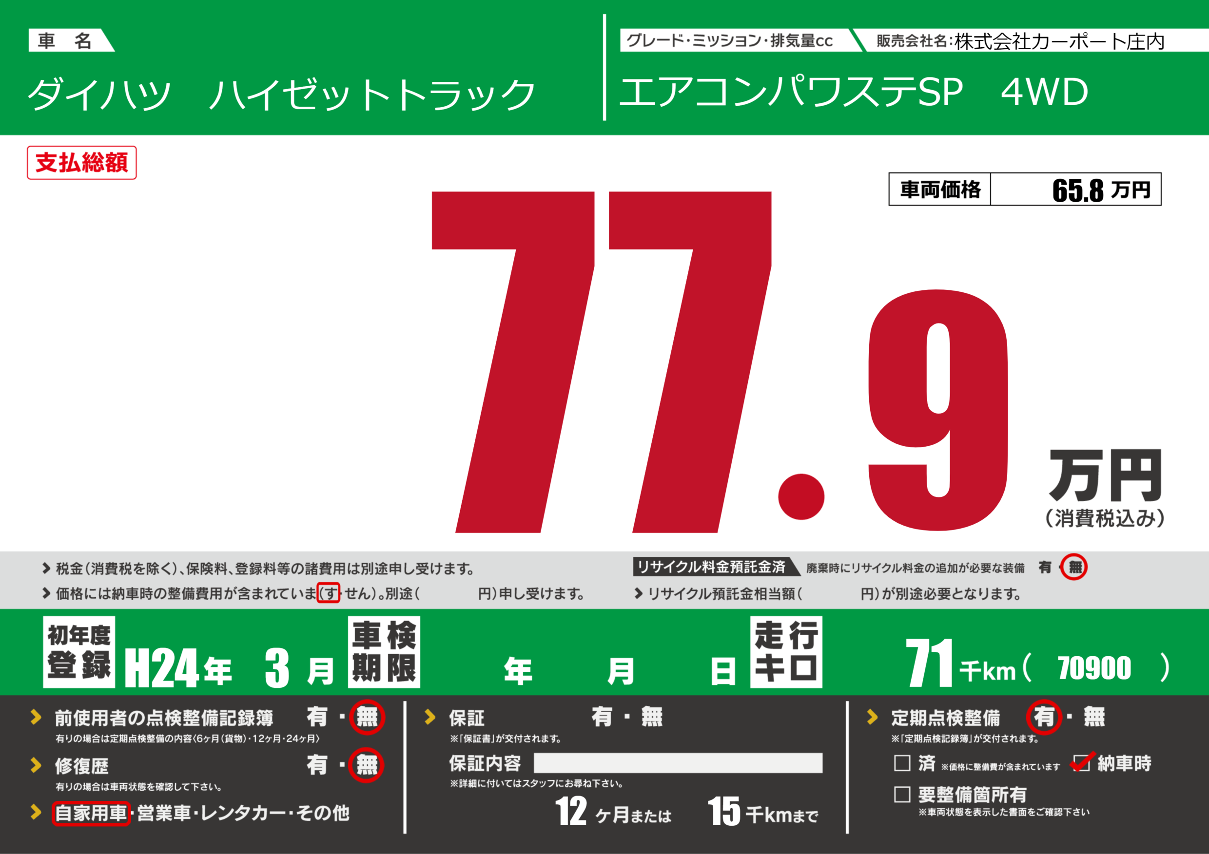 | 定期点検整備 | 定期点検整備あり 納車時あり | ||