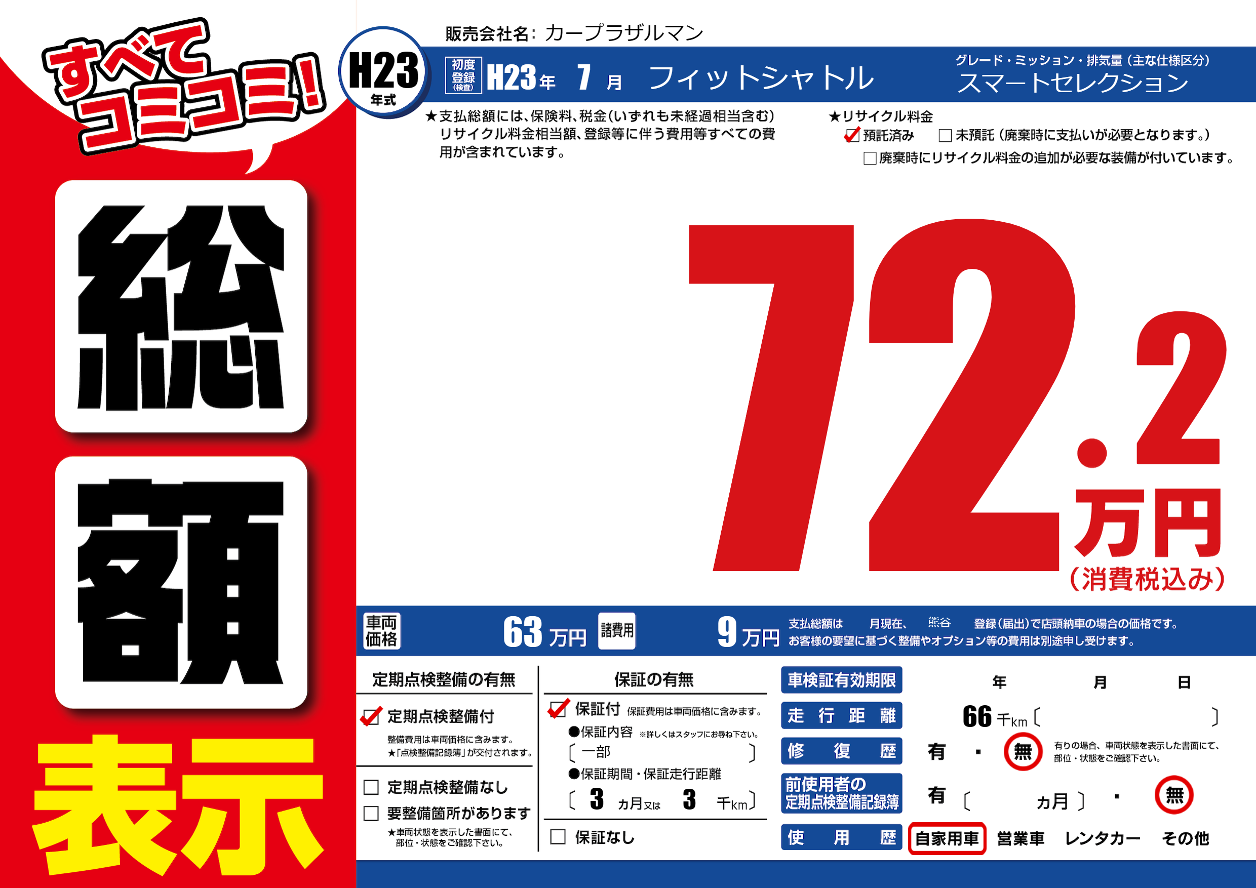 | 走行キロ | 6.6万km | 初年度登録 | H23年7月 |