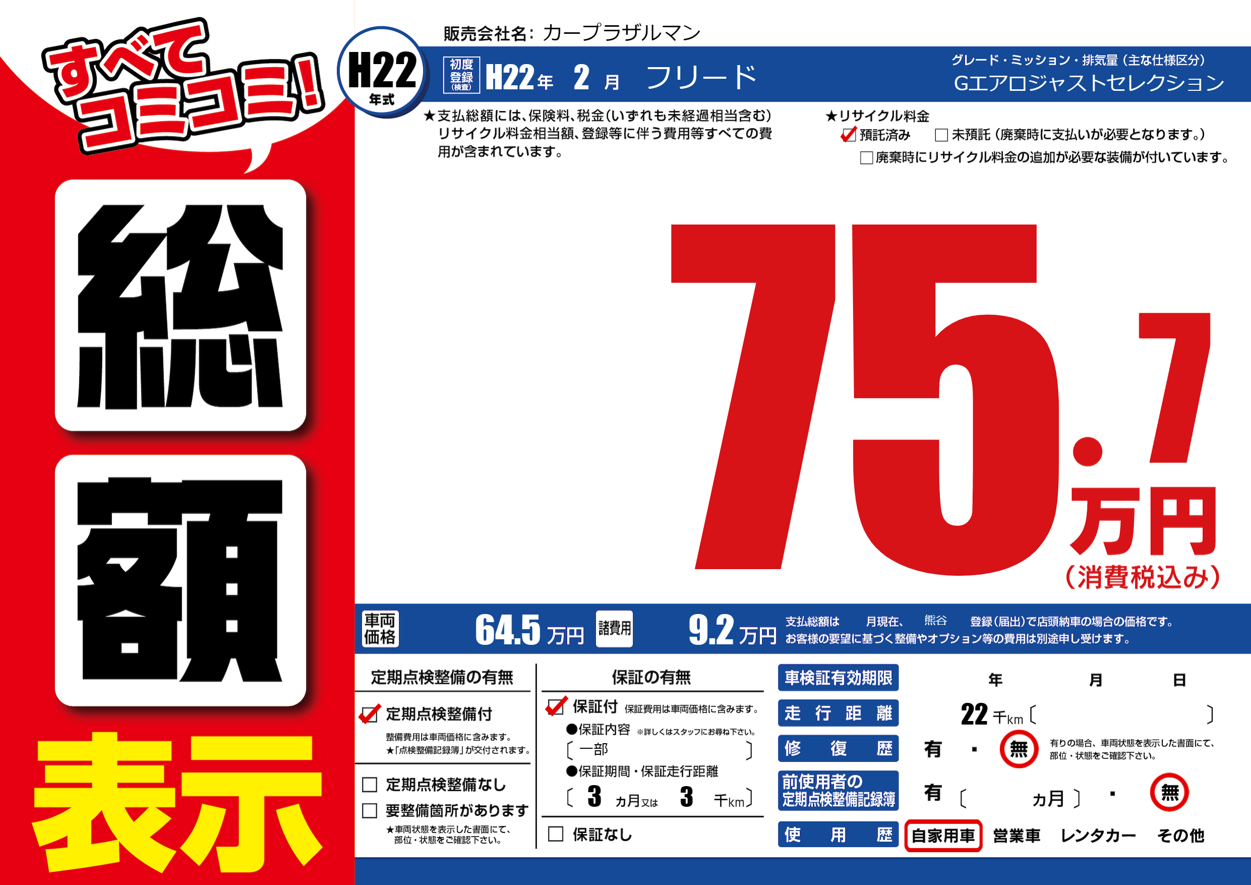 あり | リサイクル預託金相当額 | ( 0円)が別途必要 |