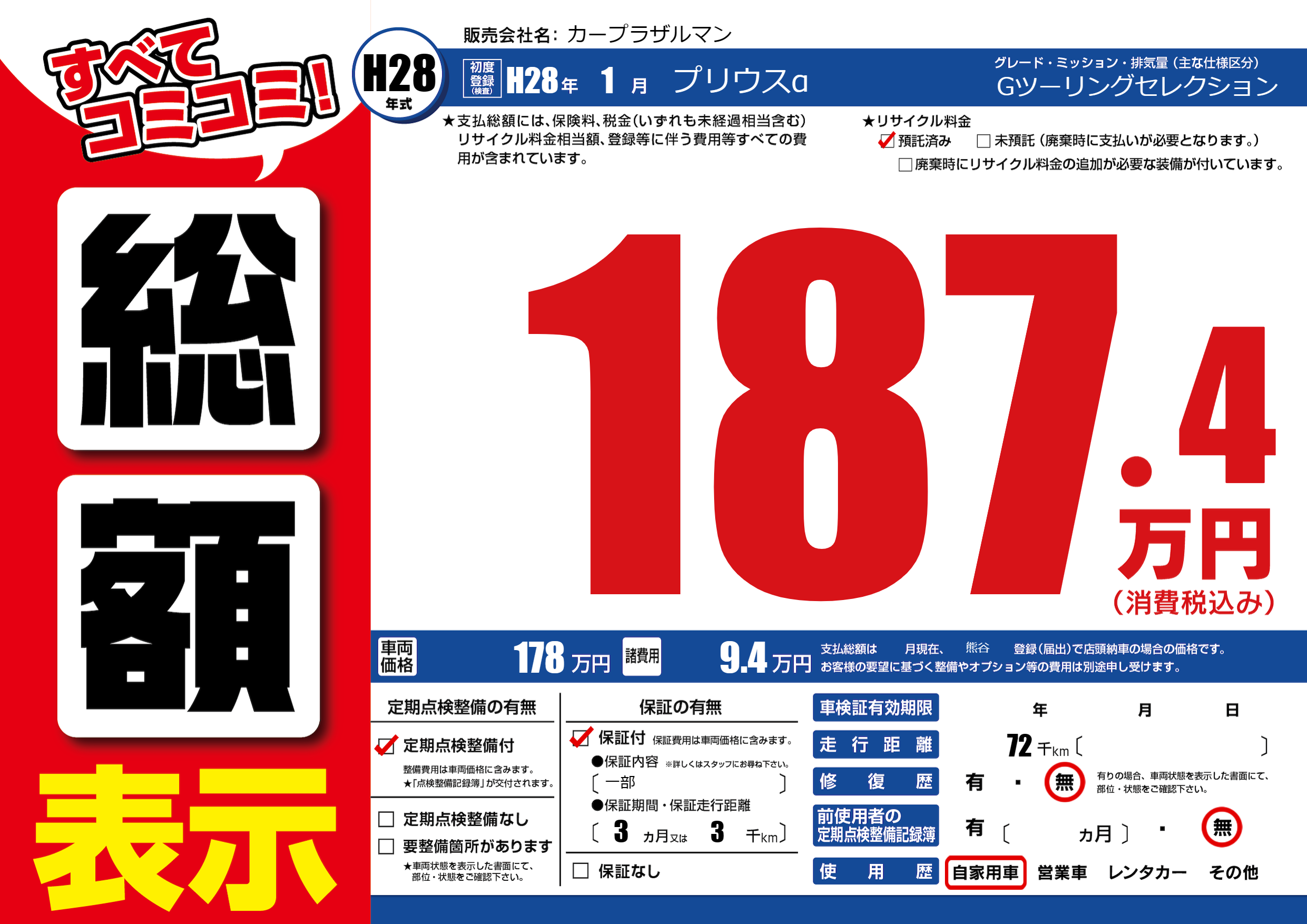 | 車名 | プリウスα | グレード ミッション 排気量 |