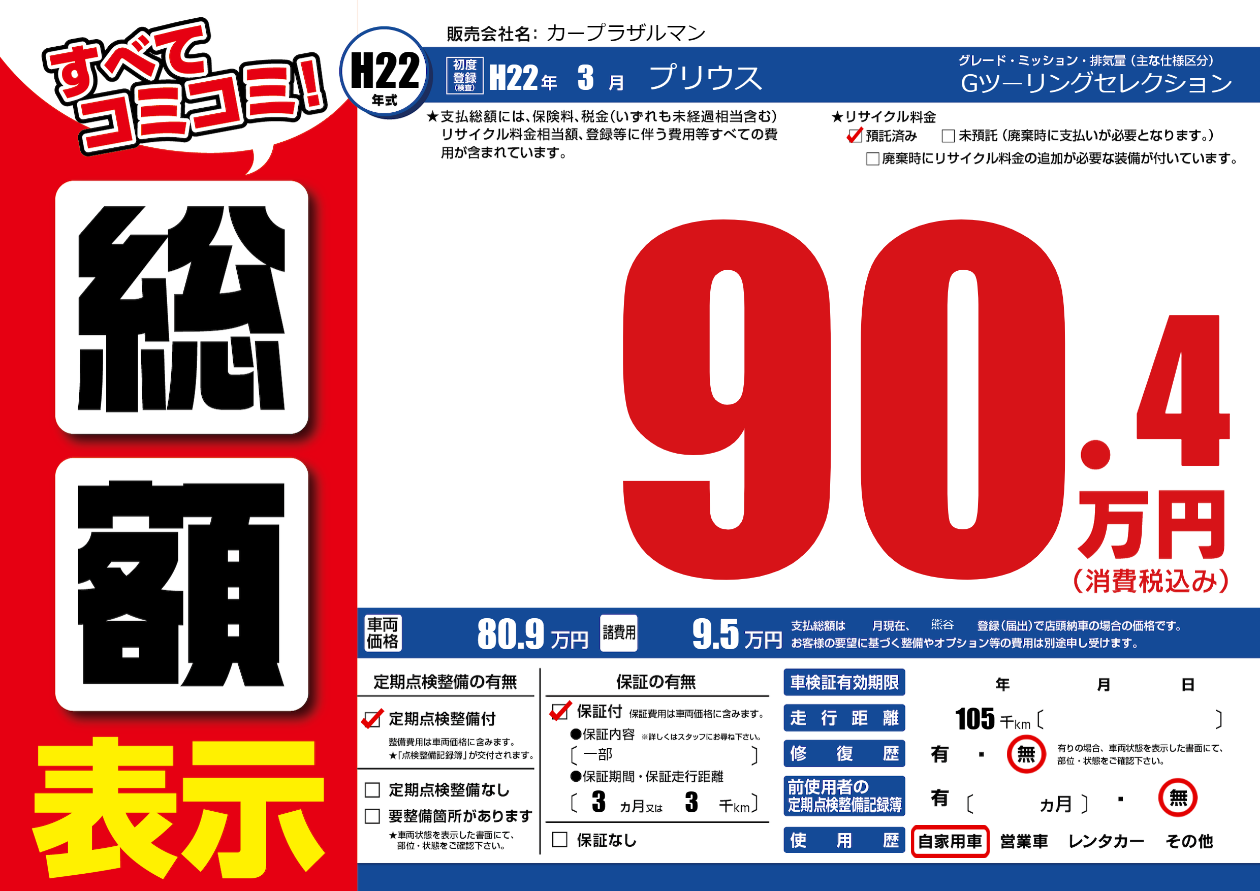 | 車名 | プリウス | グレード ミッション 排気量 |
