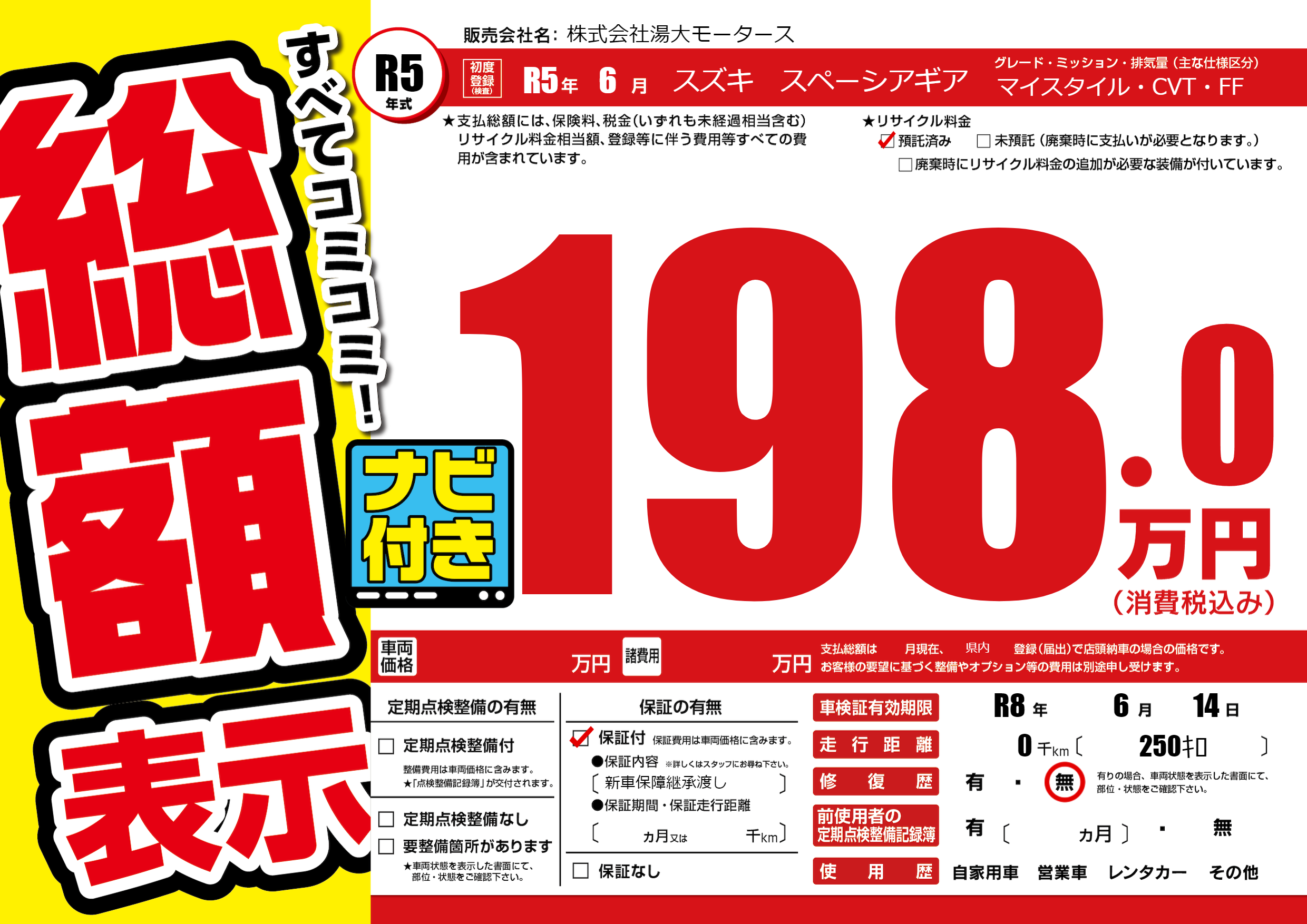 | 車名 | スズキ スペーシアギア | グレード ミッション 排気量 |