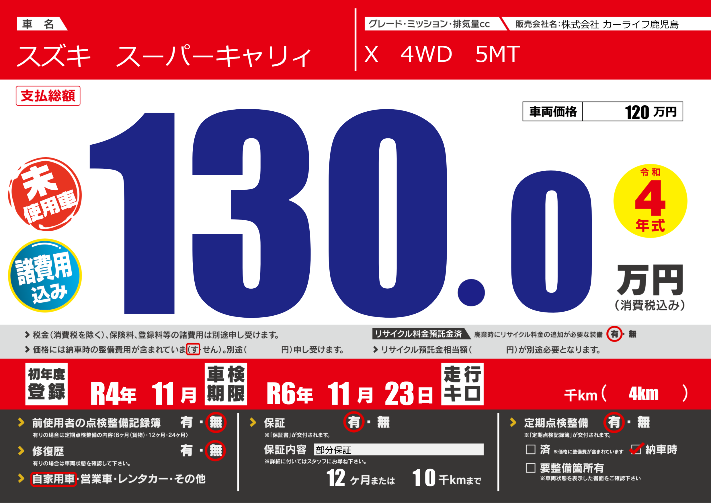保証付き 保証内容(部分保証) 12ヶ月または(1 0)千kmまで |