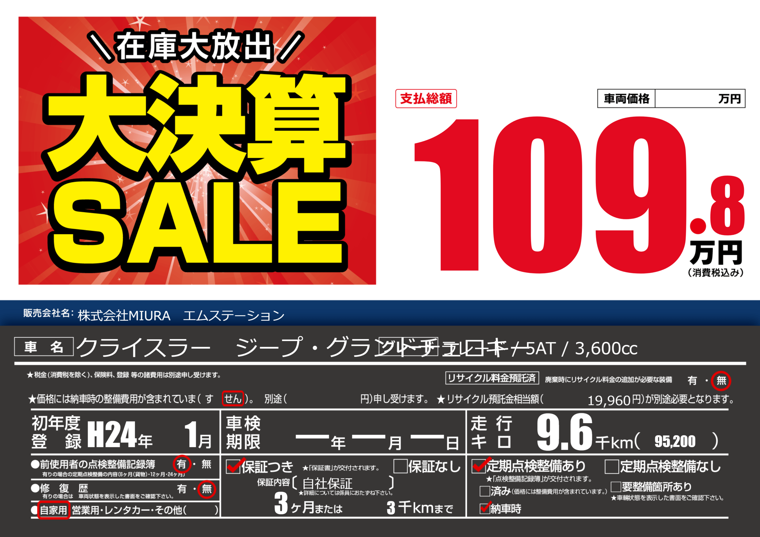 | 車名 | クライスラー ジープ・グランドチェロキー | グレード ミッション 排気量 |