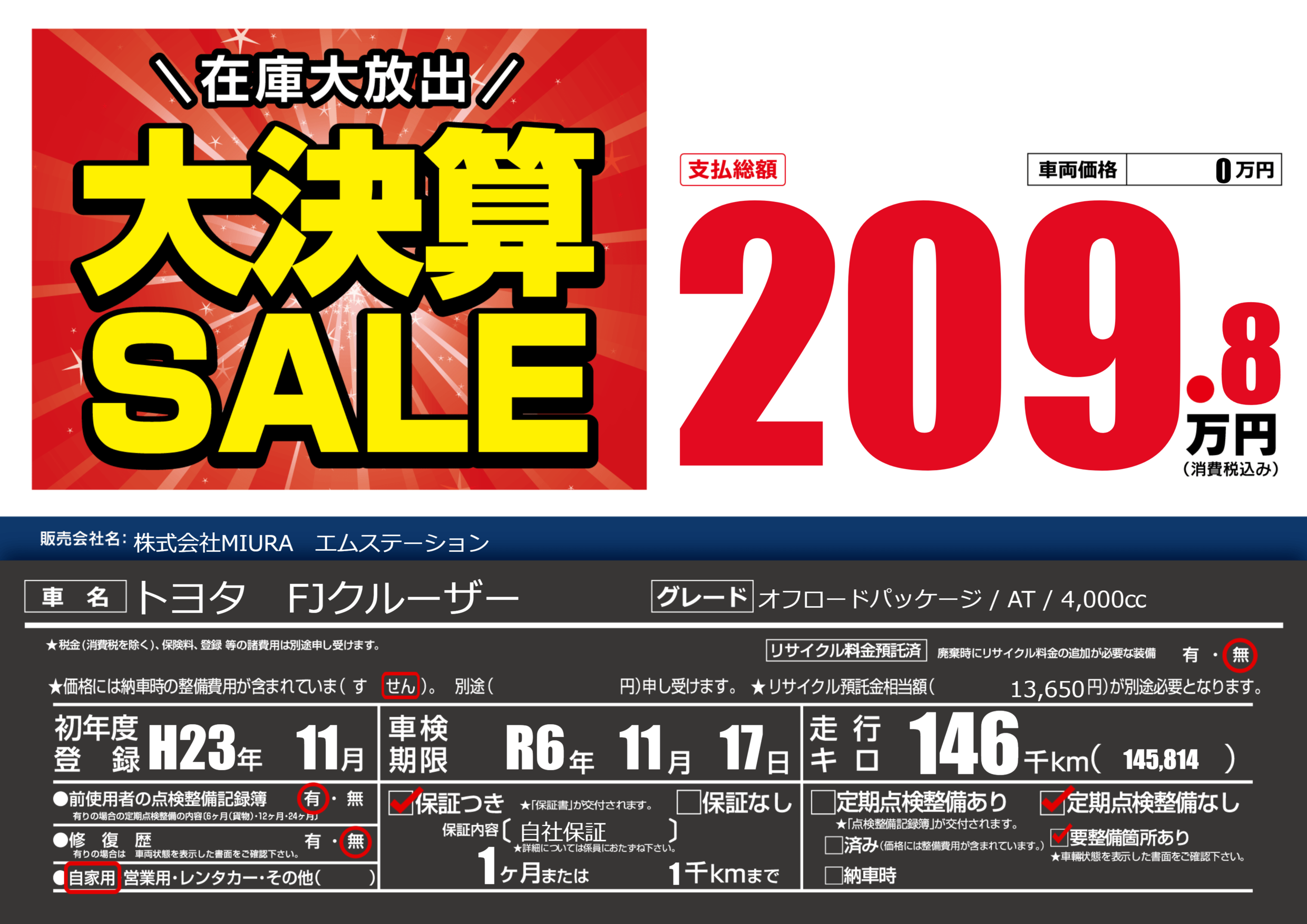 | 車名 | トヨタ FJクルーザー | グレード ミッション 排気量 |