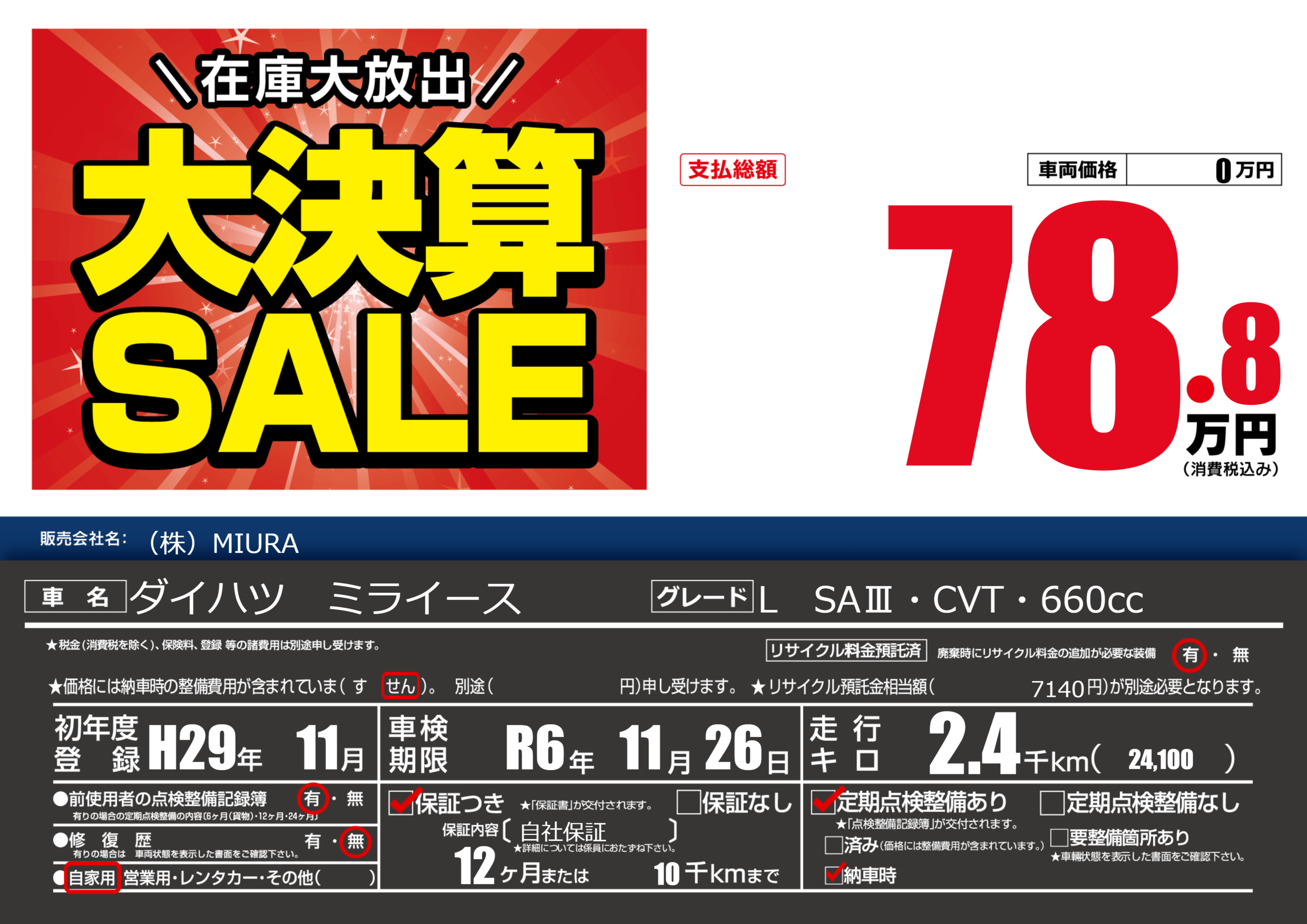 | 定期点検整備 | 定期点検整備あり 納車時あり | ||