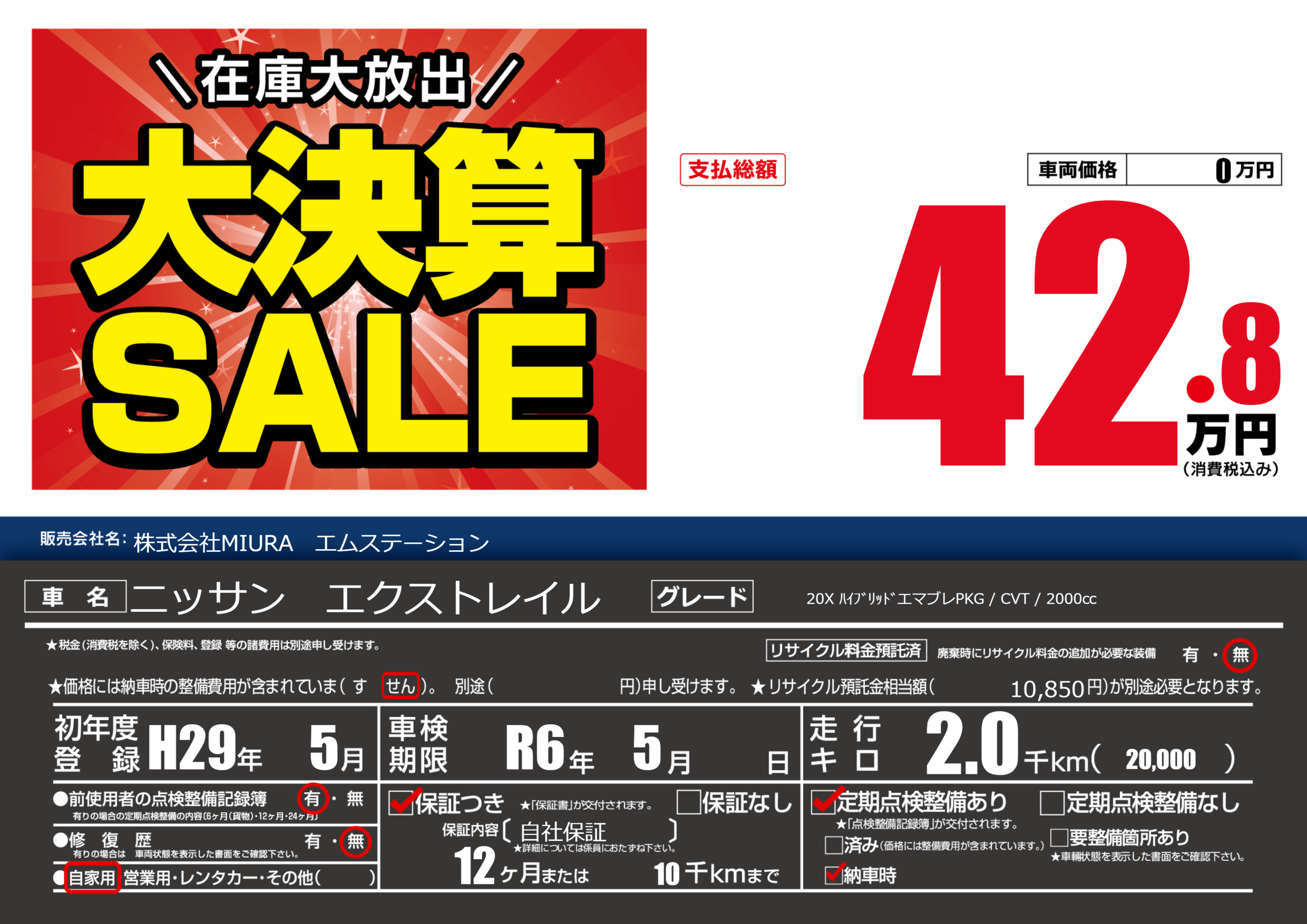 | 車名 | ニッサン エクストレイル | グレード ミッション 排気量 |