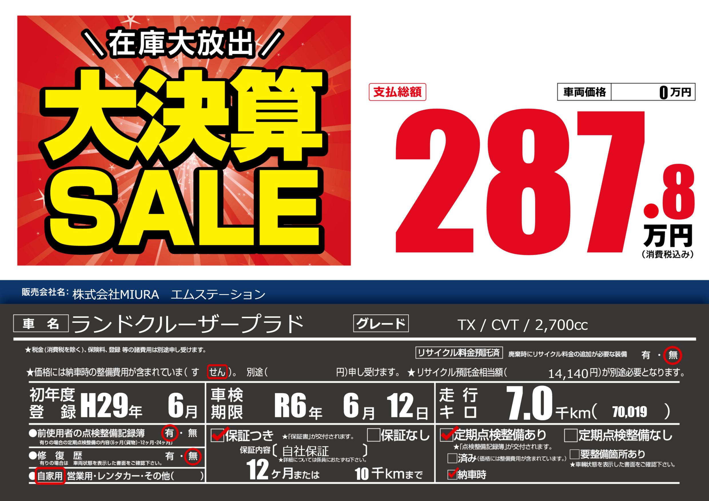 | 車名 | ランドクルーザープラド | グレード ミッション 排気量 |