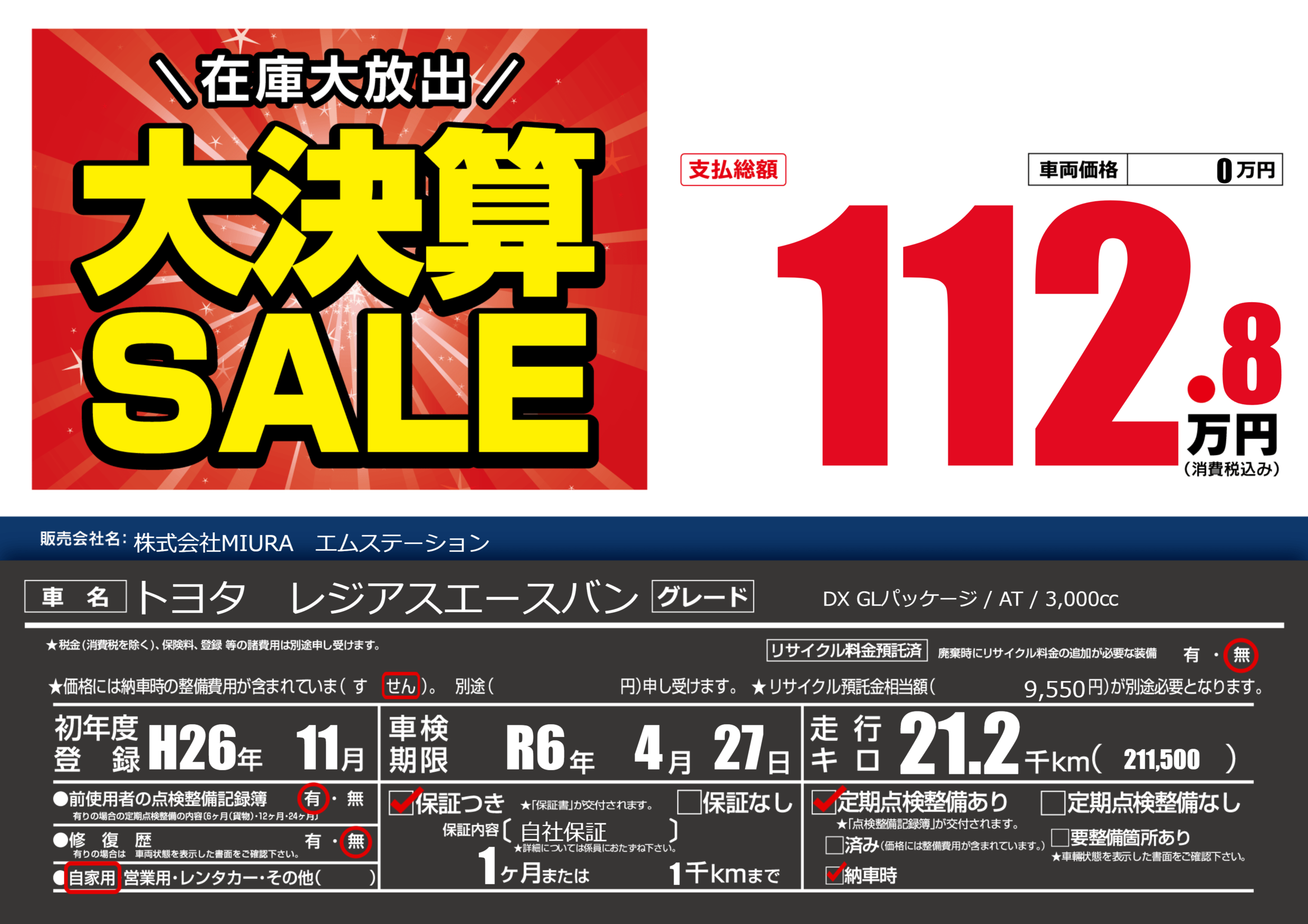 | 車名 | トヨタ レジアスエースバン | グレード ミッション 排気量 |