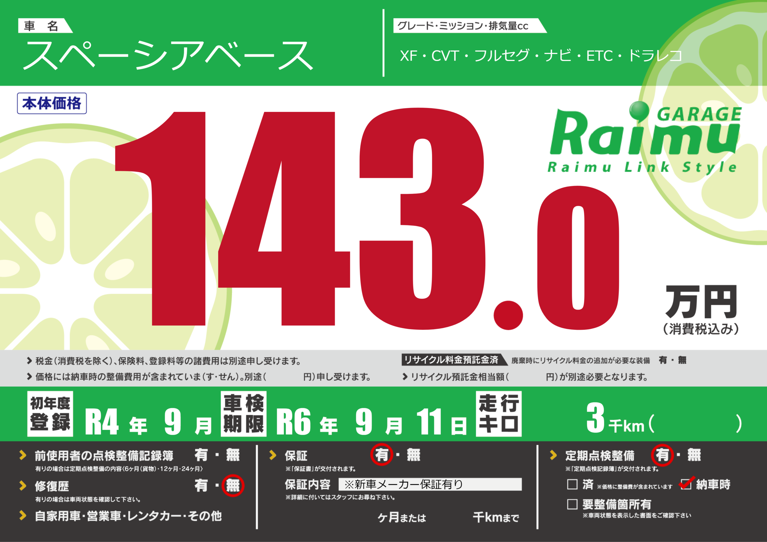 なし | 車検制限 | R6年9月11月 |