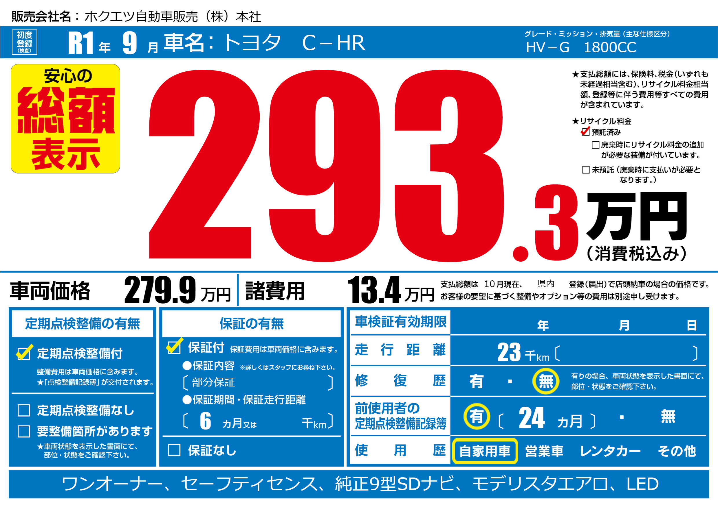 | 車名 | トヨタ C-HR | グレード ミッション 排気量 |