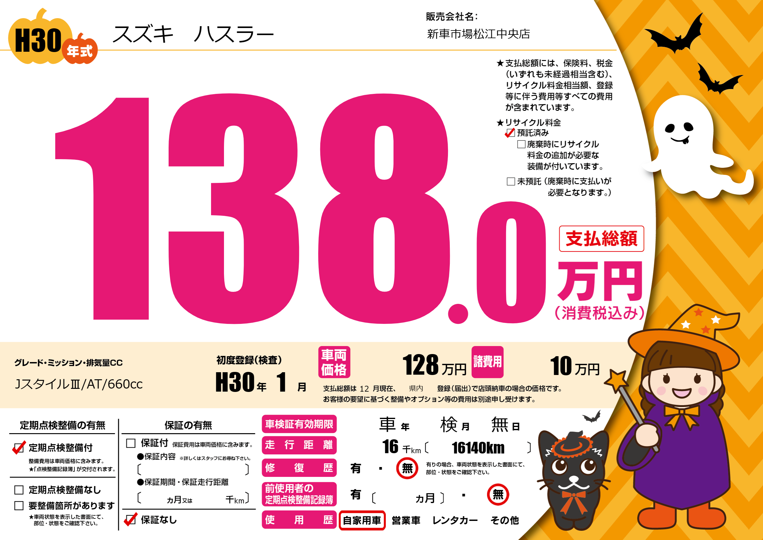 | 車名 | スズキ ハスラー | グレード ミッション 排気量 |