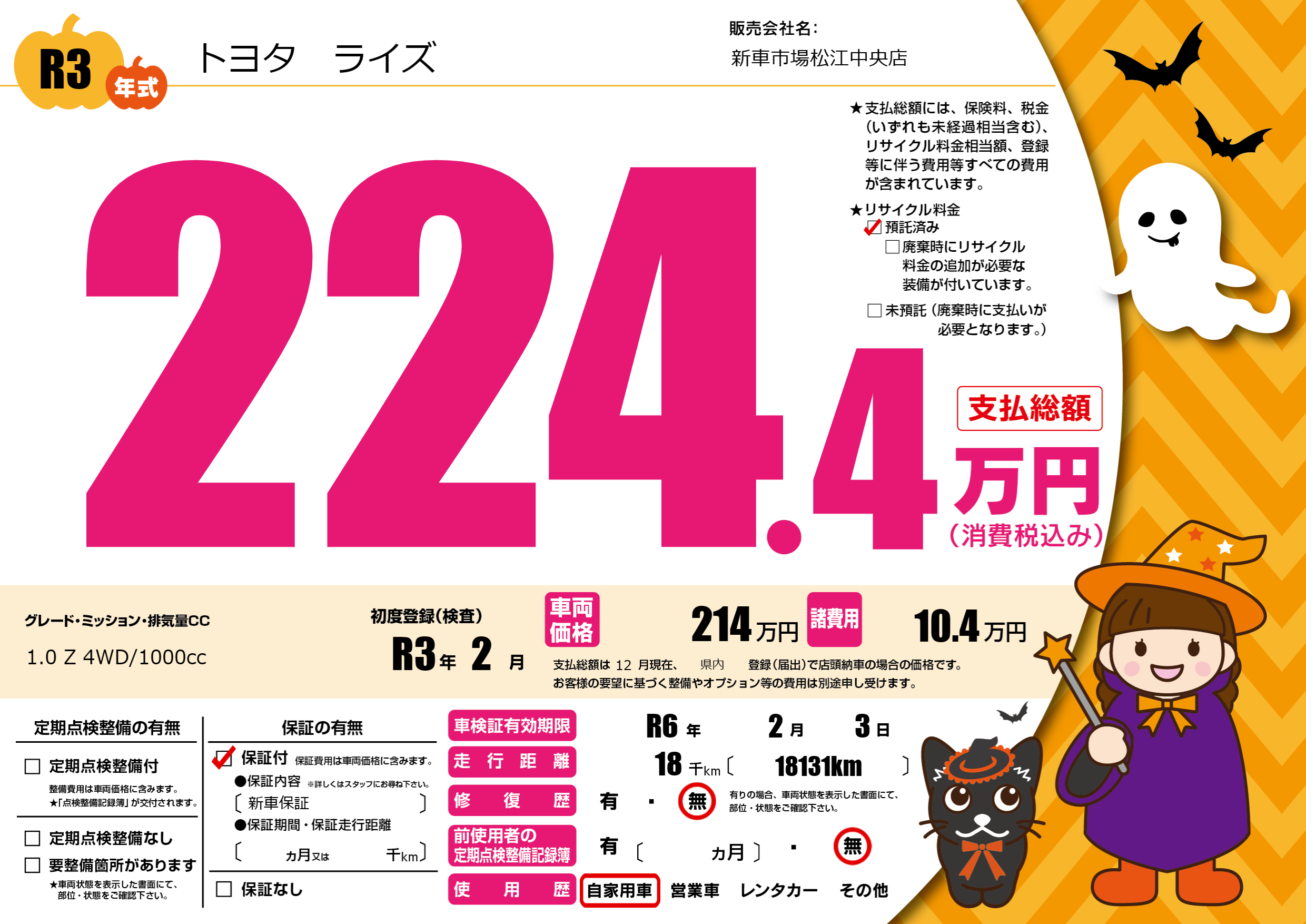 | 車名 | トヨタ ライズ | グレード ミッション 排気量 |